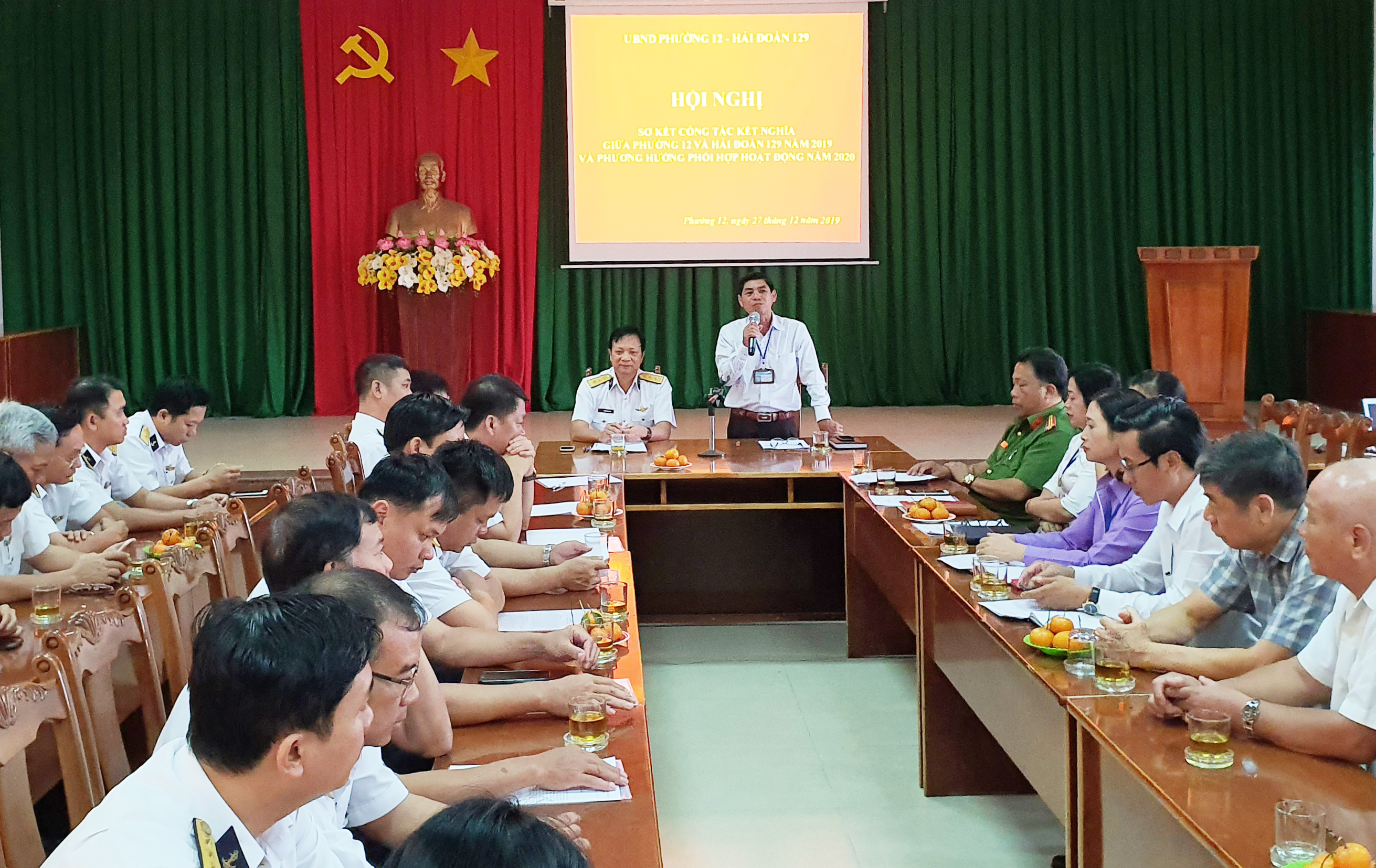 Chiều 27-12, tại phường 12, TP. Vũng Tàu, Hải đoàn 129, Quân cảng Sài Gòn phối hợp với phường 12 tổ chức Hội nghị sơ kết công tác kết nghĩa năm 2019. Thượng tá Huỳnh Văn Đa, Bí thư Đảng ủy, Chính ủy Hải đoàn và đồng chí Trần Văn Phức, Chủ tịch UBND phường 12 đồng chủ trì.