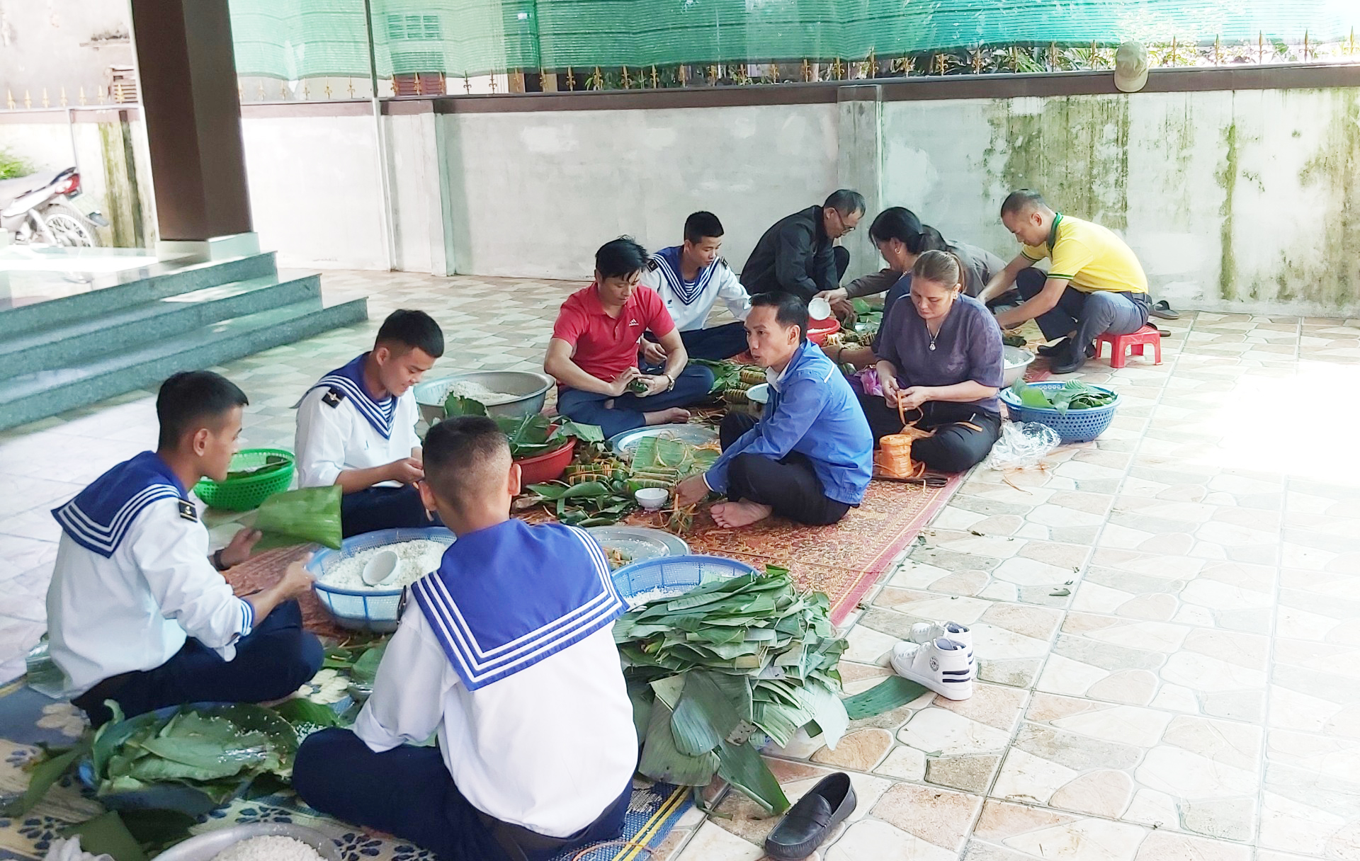 Chiến sĩ Hải đội 137 cùng nhân dân xã Phúc Thọ gói bánh chưng tặng bà con vùng lũ