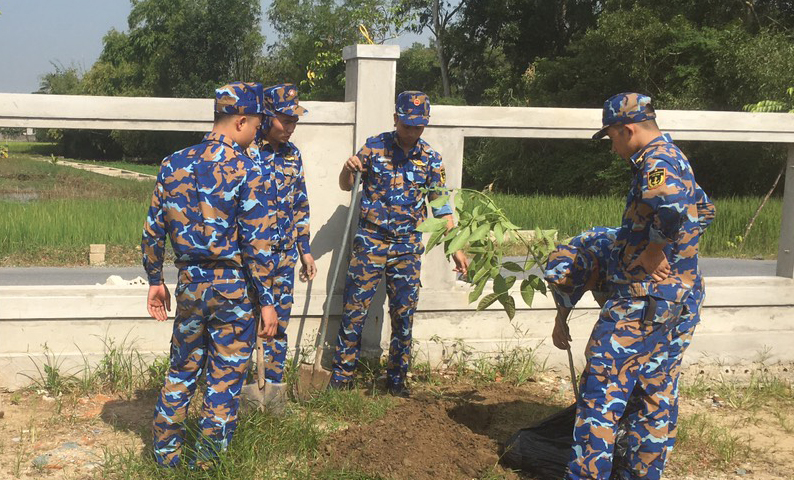 Cán bộ, chiến sĩ trồng cây tại tại Nhà văn hóa Thôn 4, xã Phúc Thọ