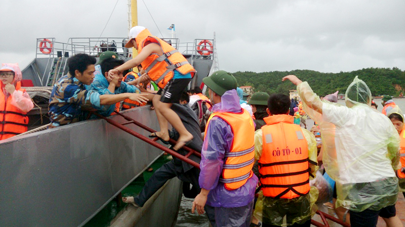 Cán bộ, chiến sĩ Tàu 634 chở nhân dân bị mắc kẹt ở đảo Cô Tô (Quảng Ninh) do cơn bão số 6 về đất liền năm 2015. (Ảnh: Văn Tuân)