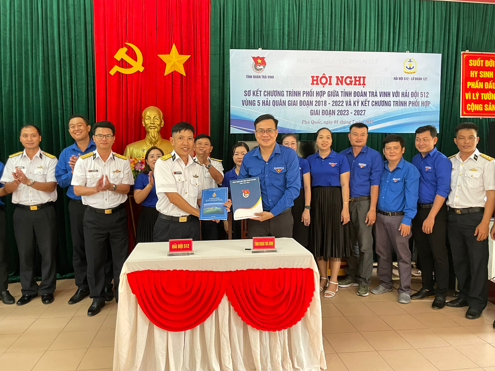 Chiều 1/7, tại TP. Phú Quốc, tỉnh Kiên Giang, Hải đội 512, Lữ đoàn 127, Vùng 5 Hải quân và Tỉnh đoàn Trà Vinh tổ chức Hội nghị sơ kết chương trình phối hợp hoạt động giai đoạn 2018-2022; ký kết chương trình phối hợp hoạt động giai đoạn 2023-2027.