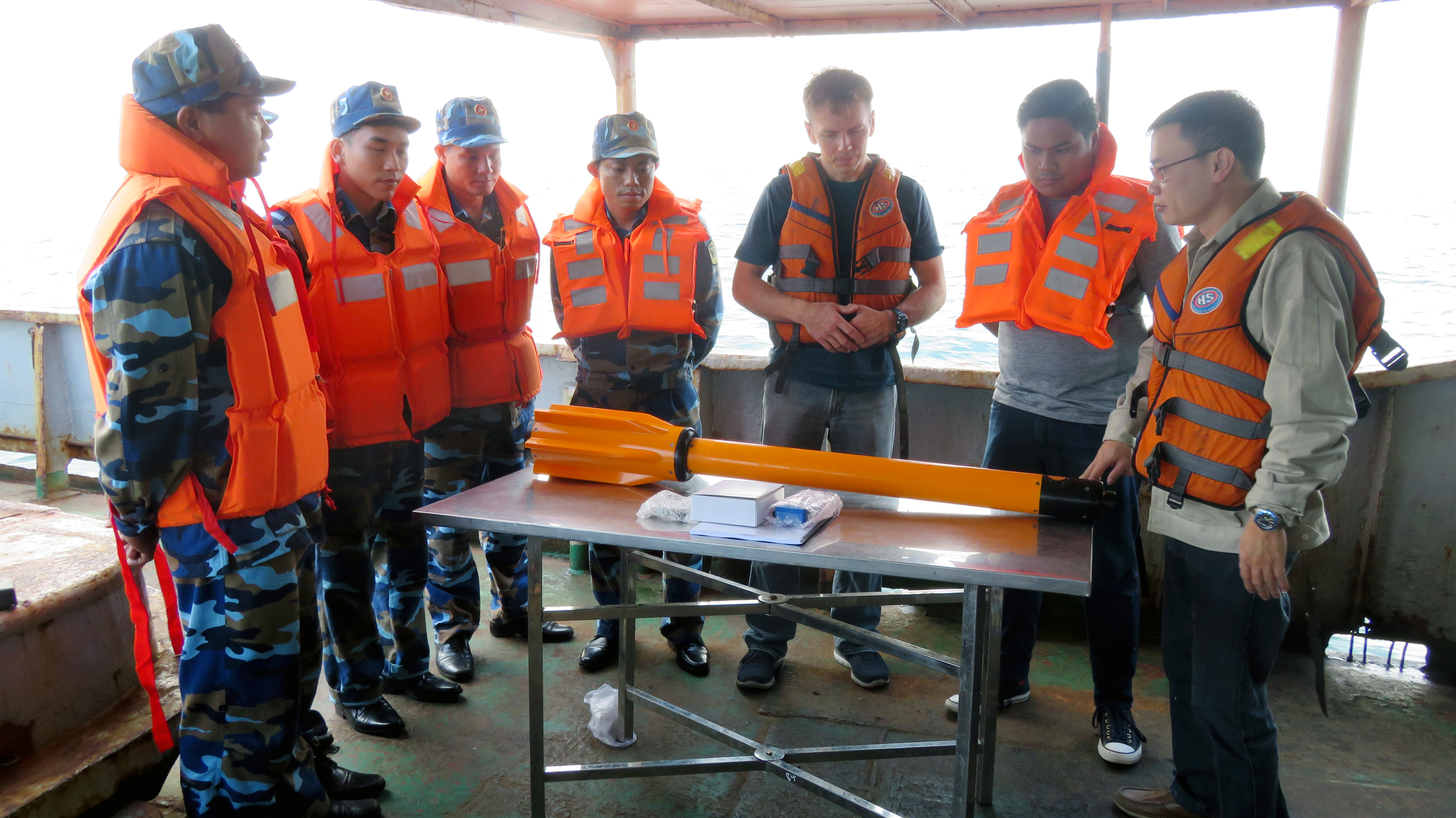 Chuyên gia nước ngoài hướng dẫn cán bộ, nhân viên Tàu 884 sử dụng trang bị kỹ thuật mới. Ảnh: TTV