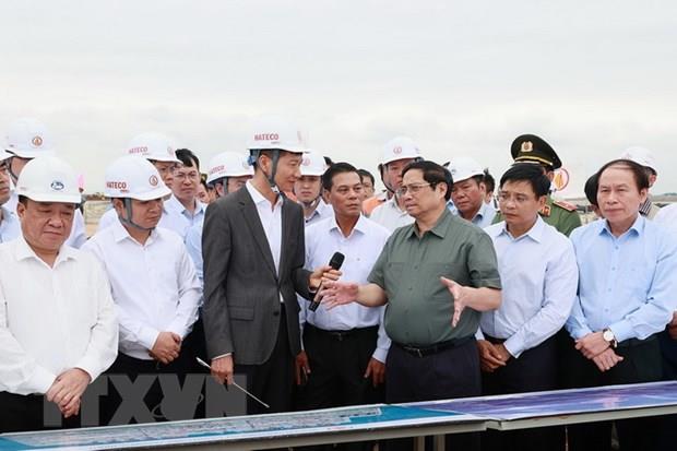 Khảo sát, kiểm tra thi công và tặng quà cán bộ, kỹ sư, công nhân đang thi công công trình, Thủ tướng Chính phủ Phạm Minh Chính yêu cầu thường xuyên đôn đốc, kiểm tra giám sát, động viên công nhân trên công trường tổ chức thi công 3 ca, 4 kíp, tranh thủ thời tiết, đẩy nhanh tiến độ, rút ngắn thời gian thi công, phấn đấu hoàn thành dự án sớm hơn so với kế hoạch.