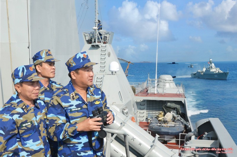 Tư lệnh Hải quân chỉ đạo diễn tập trên biển. Ảnh: Trọng Thiết