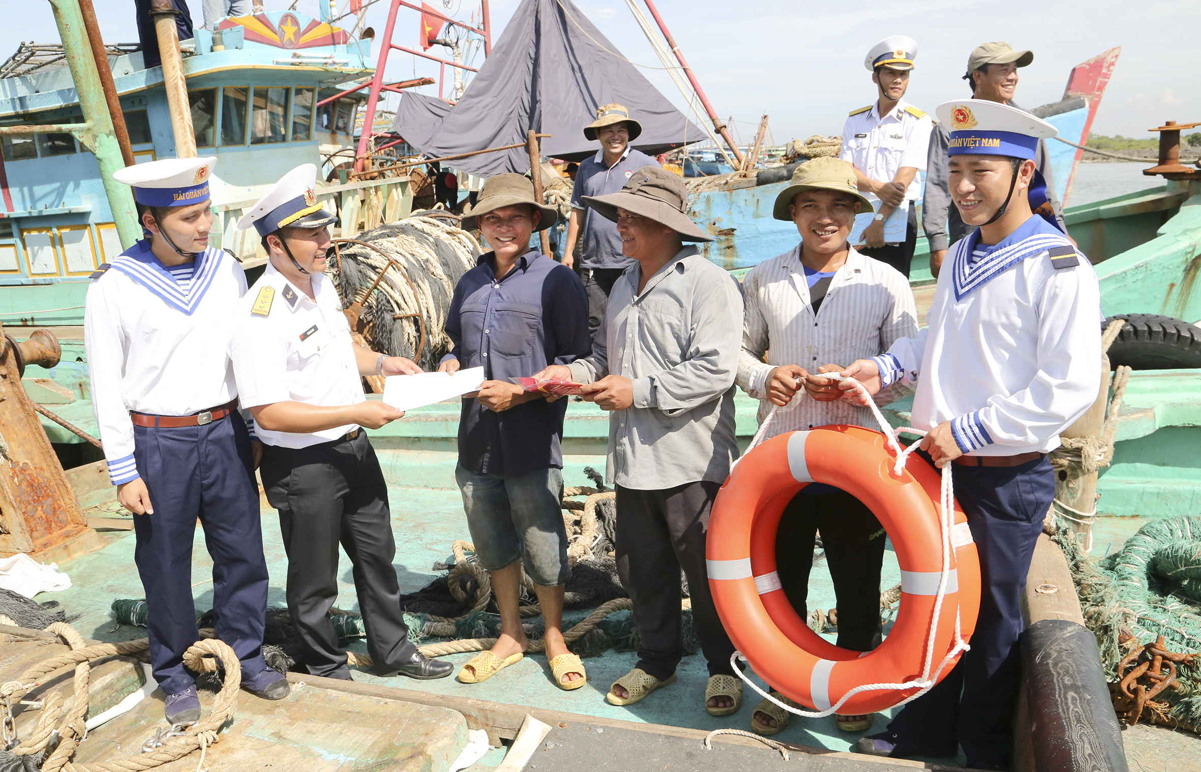 Cán bộ, chiến sĩ Vùng 2 Hải quân phát tờ rơi, tặng cờ Tổ quốc và phao cứu sinh cho ngư dân