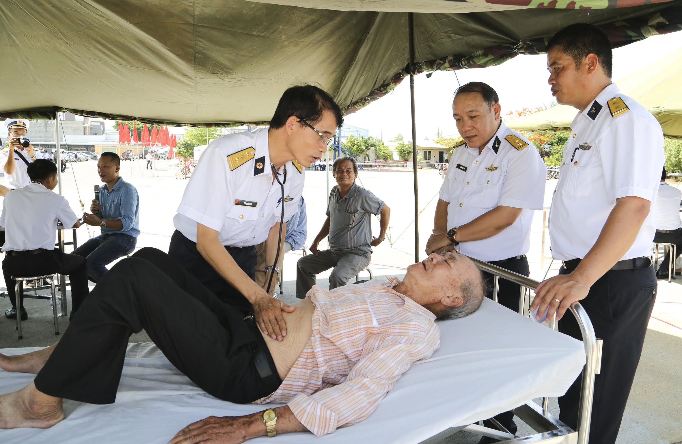Tại khu vực khám bệnh, cấp thuốc miễn phí cho ngư dân, cán bộ, nhân viên y tế của Vùng 2 Hải quân đang tích cực làm việc. Ngư dân đến khám khá đông, các y, bác sĩ phải làm việc khá vất vả nhưng nụ cười luôn nở trên môi. Không giấu được cảm xúc của mình, ông Nguyễn Chính, Giám đốc Hợp tác xã Dịch vụ khai thác thủy sản Quyết thắng, huyện Long Điền, tỉnh Bà Rịa-Vũng Tàu tâm sự: Tôi theo nghề đánh bắt trên biển nhiều năm, thu hoạch được không ít kinh nghiệm về nghề và cũng rút ra được nhiều bài học quý trong chấp hành tốt các chủ trương của Đảng, Nhà nước trong khai thác hải sản trên các vùng biển. Thú thật mỗi khi đi biển không chỉ tôi mà bất cứ ngư dân nào nếu được các lực lượng chức năng, nhất là các tàu của Hải quân hỗ trợ, giúp đỡ lúc gặp tai nạn, lúc tàu hư hỏng… thì thấy rất vững lòng. Ngư dân chúng tôi tha thiết mong muốn luôn được lực lượng Hải quân đồng hành và là chỗ dựa vững chắc để chúng tôi vững tin vươn khơi, bám biển.