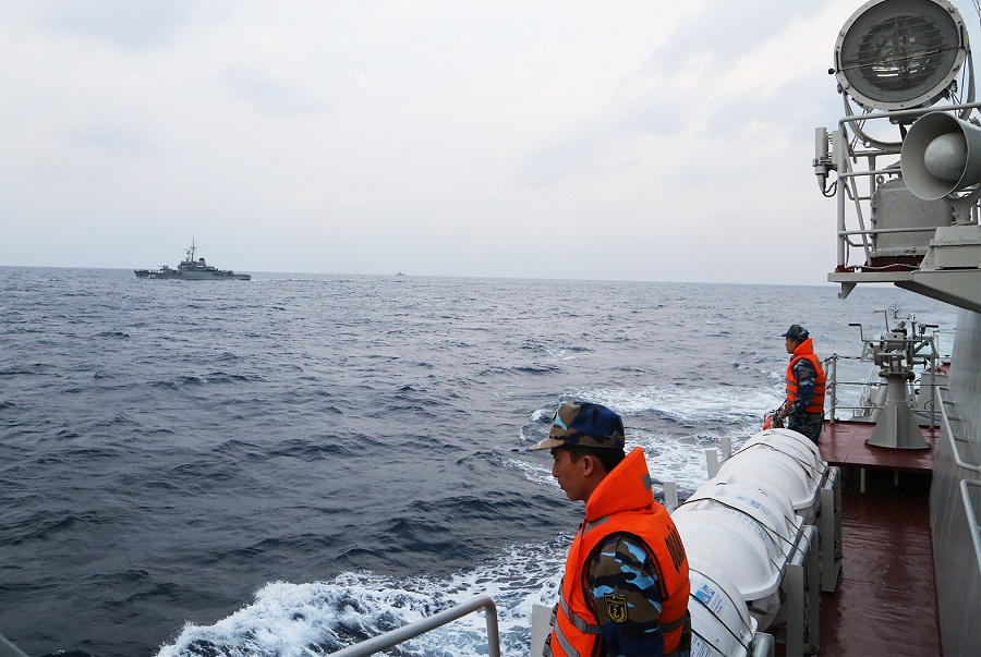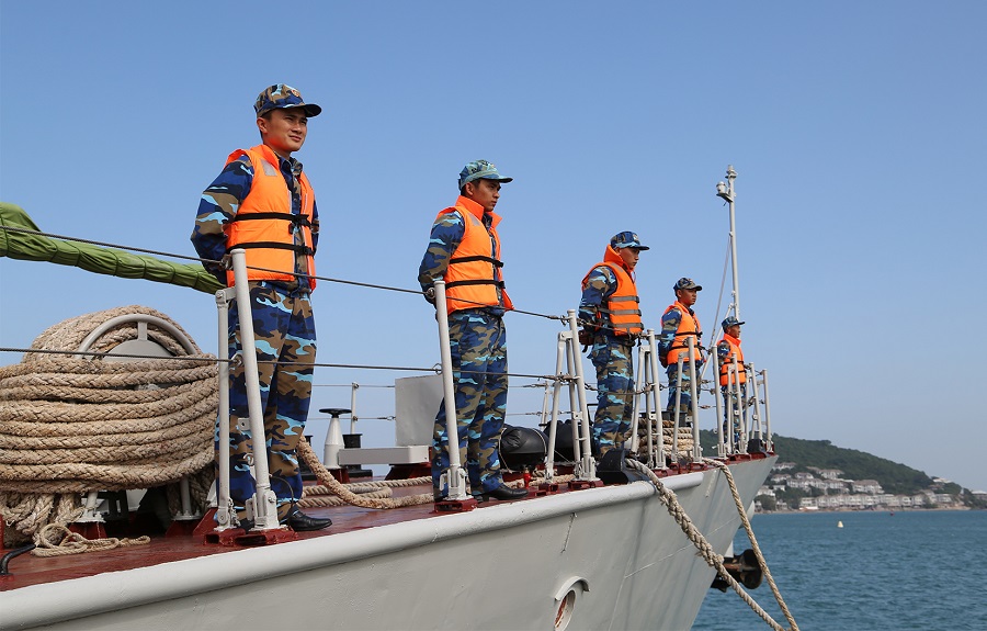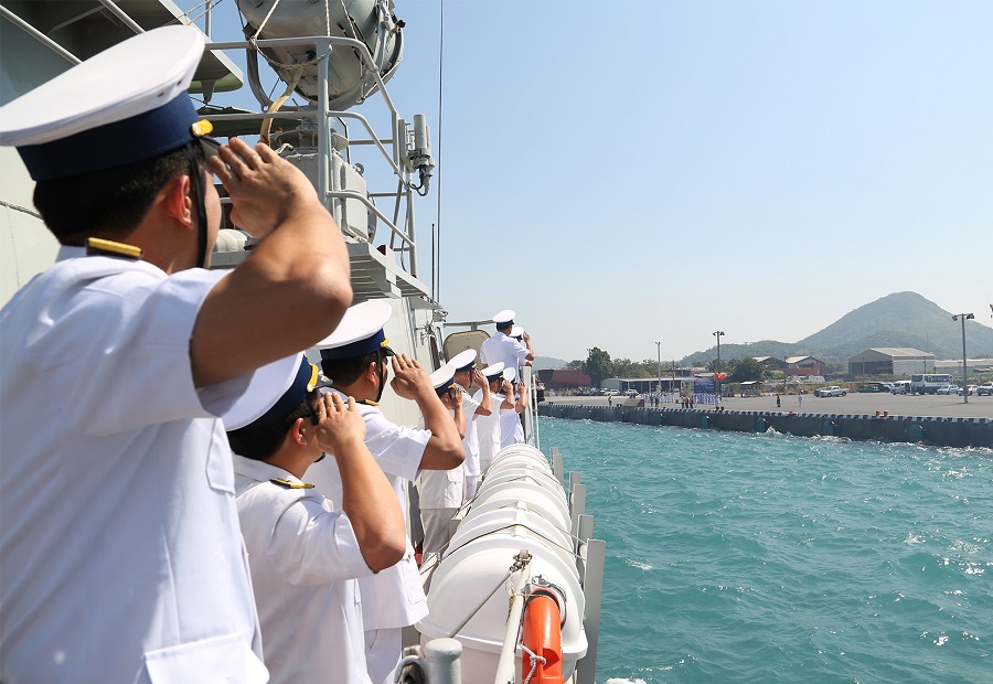Cán bộ, chiến sĩ Tàu 263 thực hiện nghi lễ chào cảng ra khơi thực hiện chuyến tuần tra chung