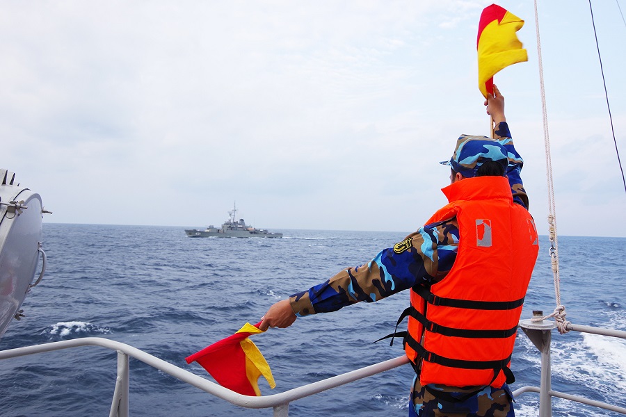 Tàu Hải quân hai nước luyện tập thông tin tín hiệu bằng cờ tay