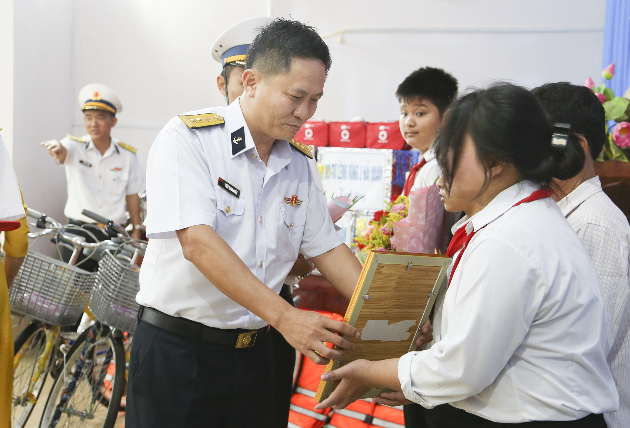 Đại tá Trần Mạnh Chiến trao Quyết định nhận đỡ đầu con ngư dân tại tỉnh Trà Vinh. Ảnh: Quang Tiến