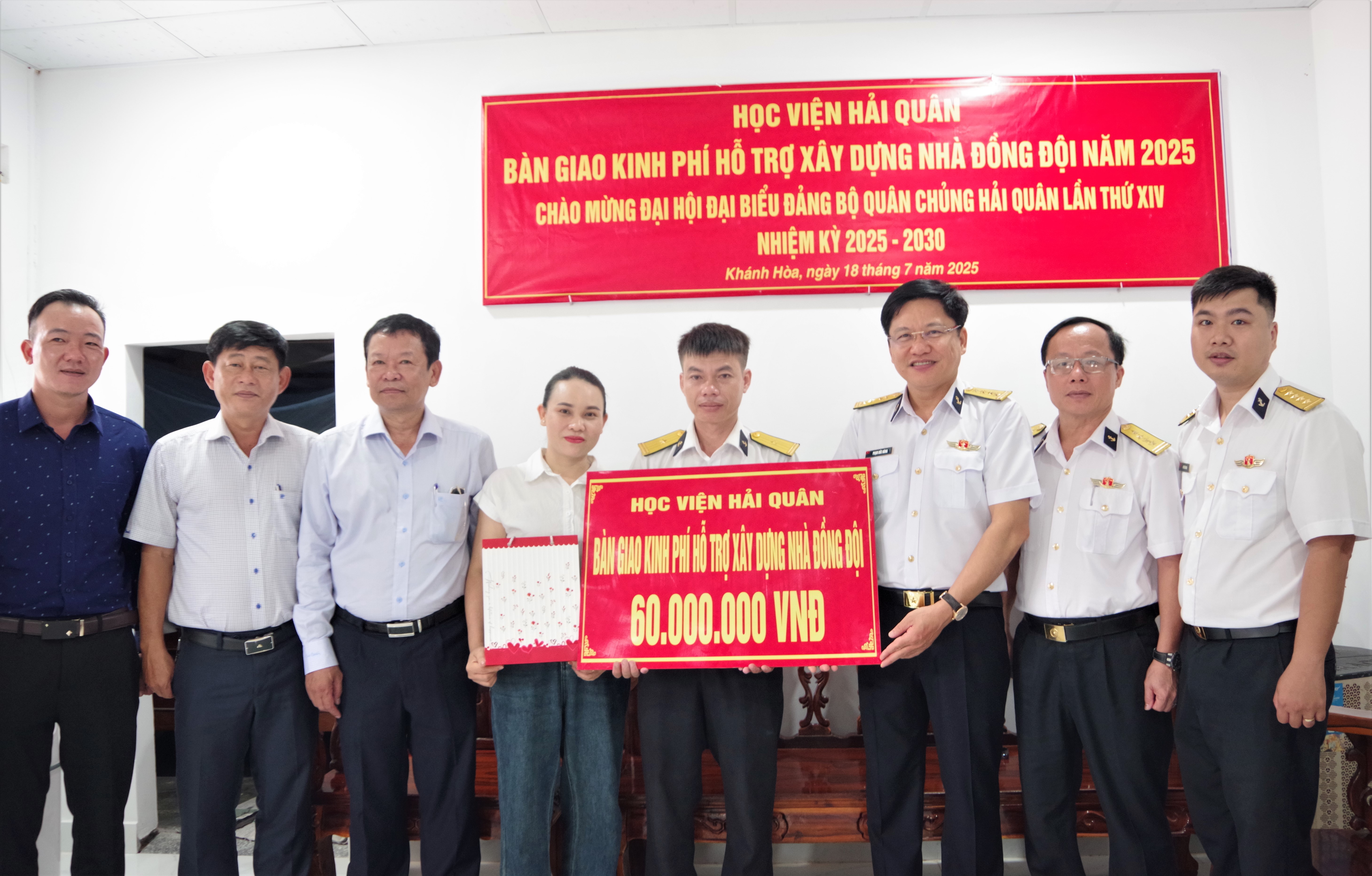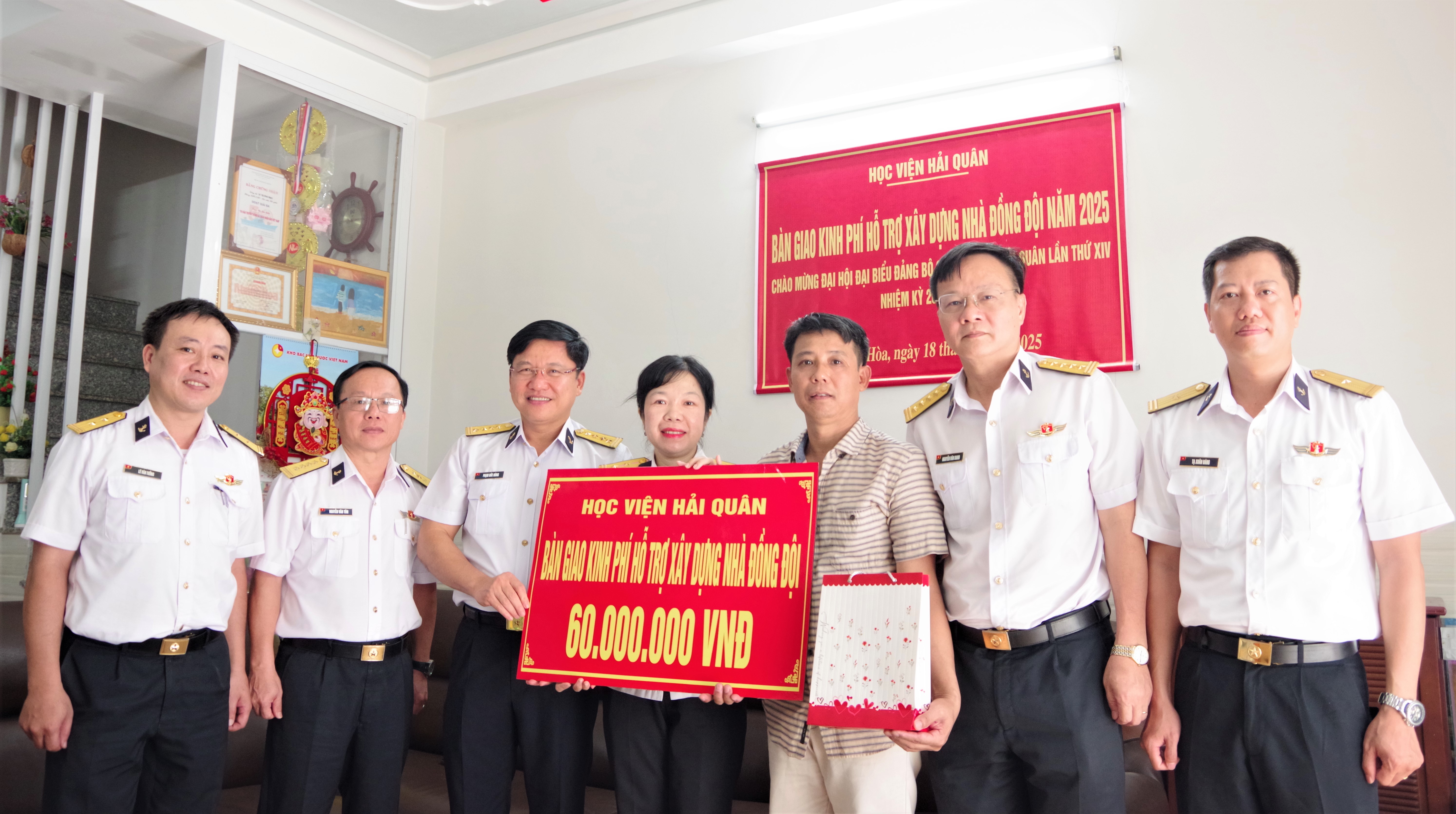 Sáng 18/7, tại phường Tây Nha Trang và phường Nam Nha Trang, tỉnh Khánh Hòa, Học viện Hải quân phối hợp với cấp ủy, chính quyền địa phương tổ chức bàn giao kinh phí hỗ trợ xây dựng nhà đồng đội cho hai gia đình: Thiếu tá Nguyễn Văn Dương, Chính trị viên Đại đội 1, Tiểu đoàn 4; Thiếu tá QNCN Lê Thị Bích Ngọc, Nhân viên, Phòng Khoa học quân sự. Tham dự có Đại tá Phạm Đức Hùng, Phó chính ủy Học viện; đại diện Phòng Khoa học quân sự, Tiểu đoàn 4 và chính quyền địa phương.
