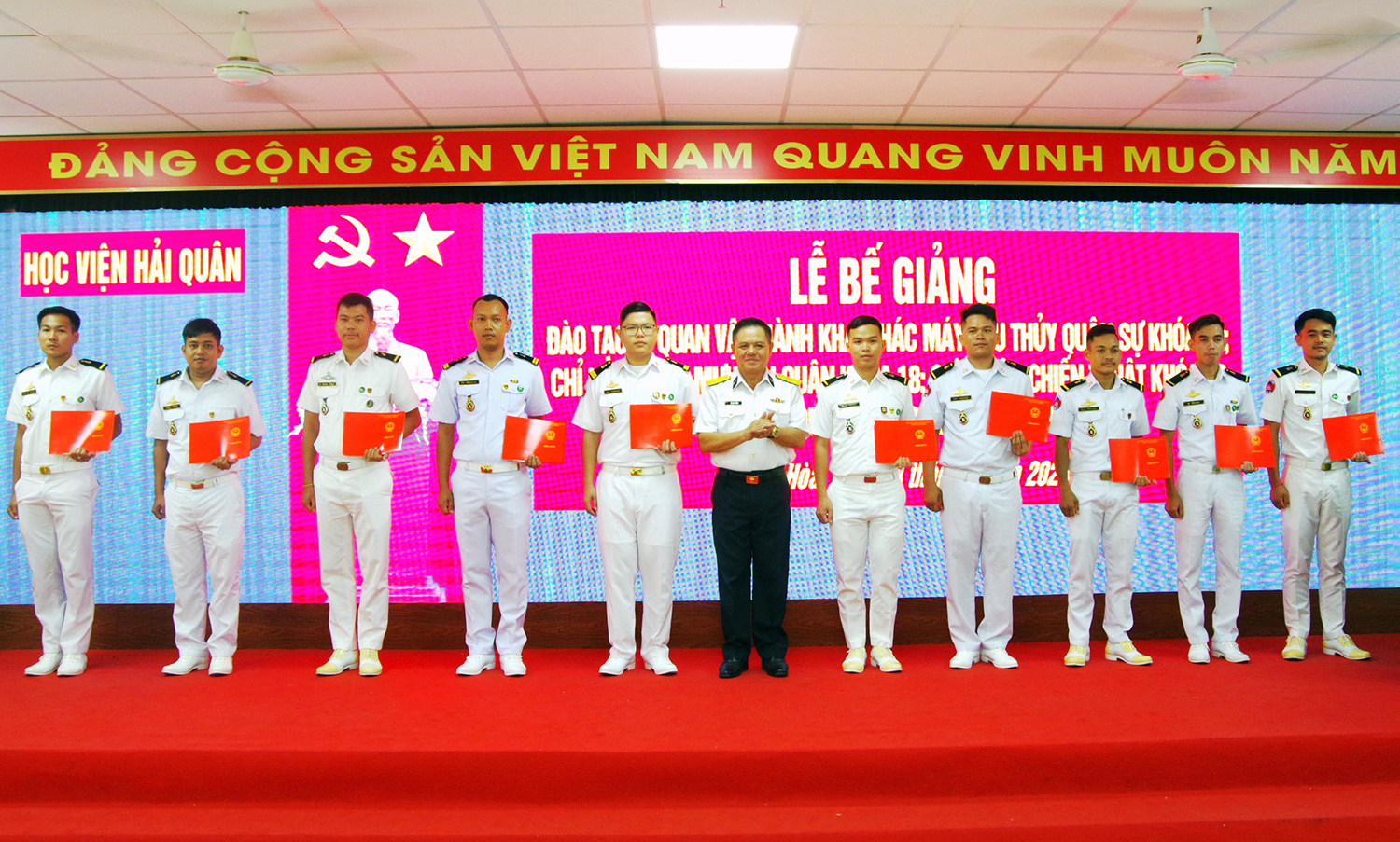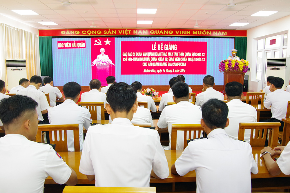 Sáng 14/6, Học viện Hải quân tổ chức Lễ bế giảng khóa đào tạo sĩ quan Hải quân Hoàng gia Cam-pu-chia năm 2024. Đại tá, Bùi Duy Thống, Phó Chính ủy Học viện dự và chủ trì. Dự lễ có đại diện lãnh đạo, chỉ huy các cơ quan, khoa, đơn vị cùng toàn thể cán bộ, học viên Hệ 3.