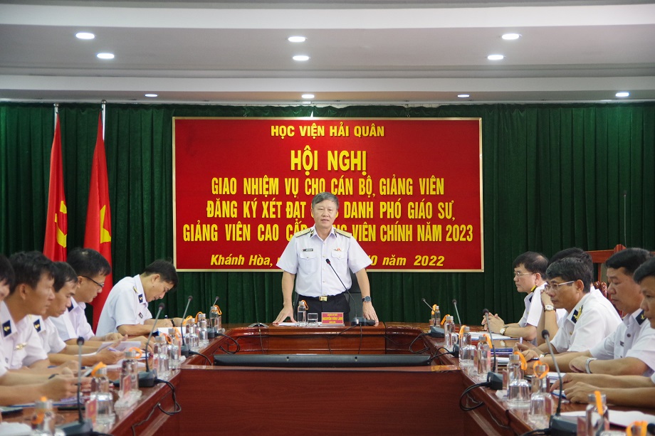 Ngày 24/10, tại TP.Nha Trang, tỉnh Khánh Hòa, Học viện Hải quân tổ chức Hội nghị giao nhiệm vụ cho cán bộ, giảng viên đăng kí xét đạt chức danh phó giáo sư, giảng viên cao cấp, giảng viên chính năm 2023. Chuẩn Đô đốc, PGS.TS Nguyễn Văn Lâm, Giám đốc Học viện chủ trì.