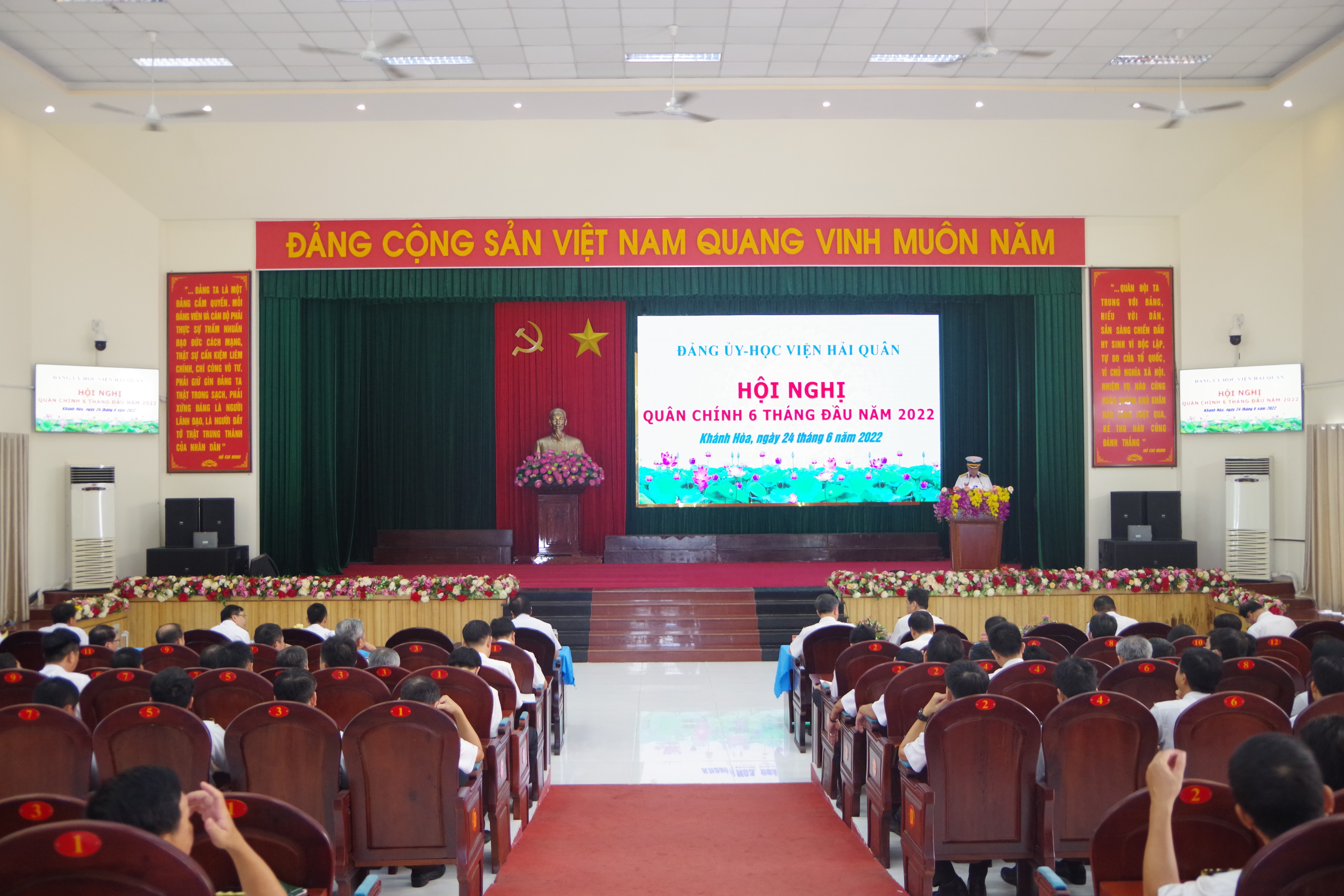 Chiều 24/6, tại TP. Nha Trang, tỉnh Khánh Hòa, Học viện Hải quân tổ chức Hội nghị Quân chính 6 tháng đầu năm 2022. Chuẩn Đô đốc Phan Tuấn Hùng, Phó Tư lệnh Hải quân dự và chỉ đạo. Chuẩn Đô đốc Nguyễn Văn Lâm, Giám đốc Học viện chủ trì. Chuẩn Đô đốc Chu Ngọc Sáng, Bí thư Đảng ủy, Chính ủy Học viện quán triệt Nghị quyết lãnh đạo 6 tháng cuối năm 2022.