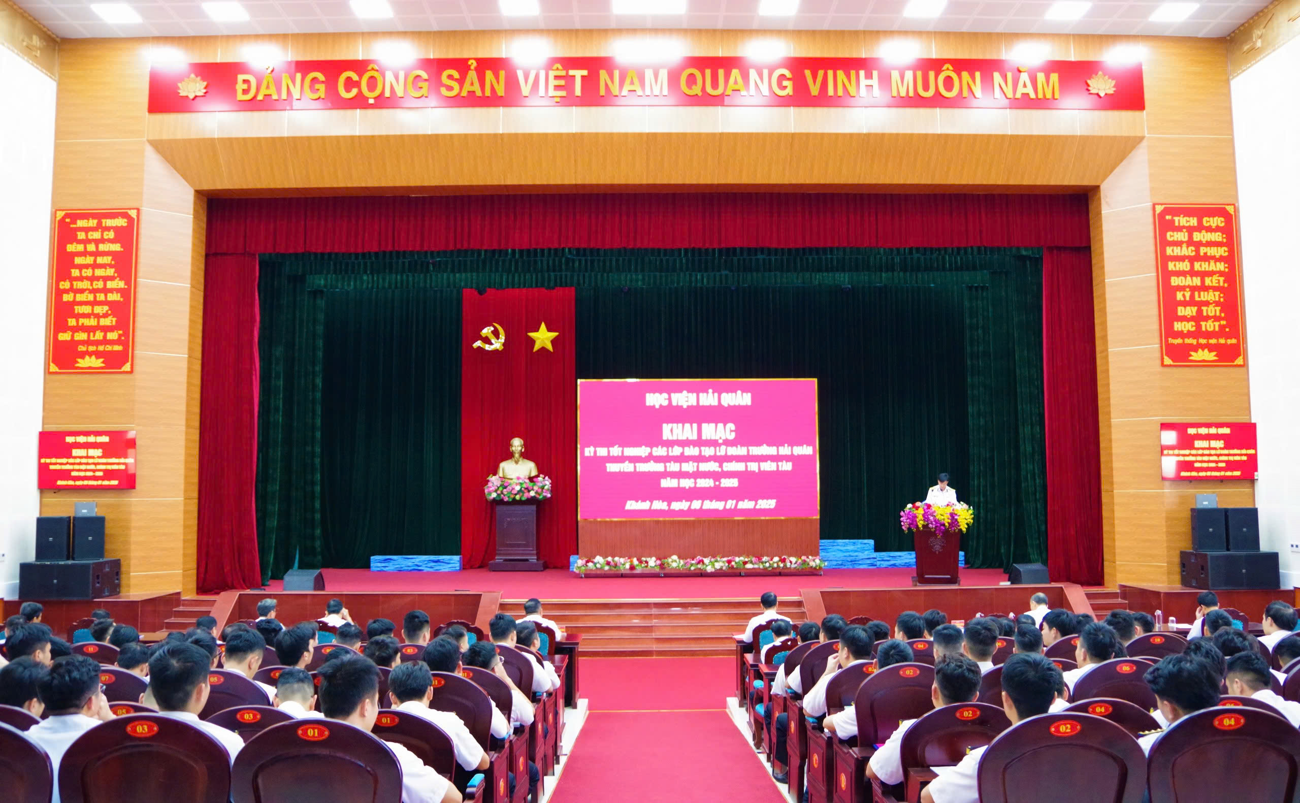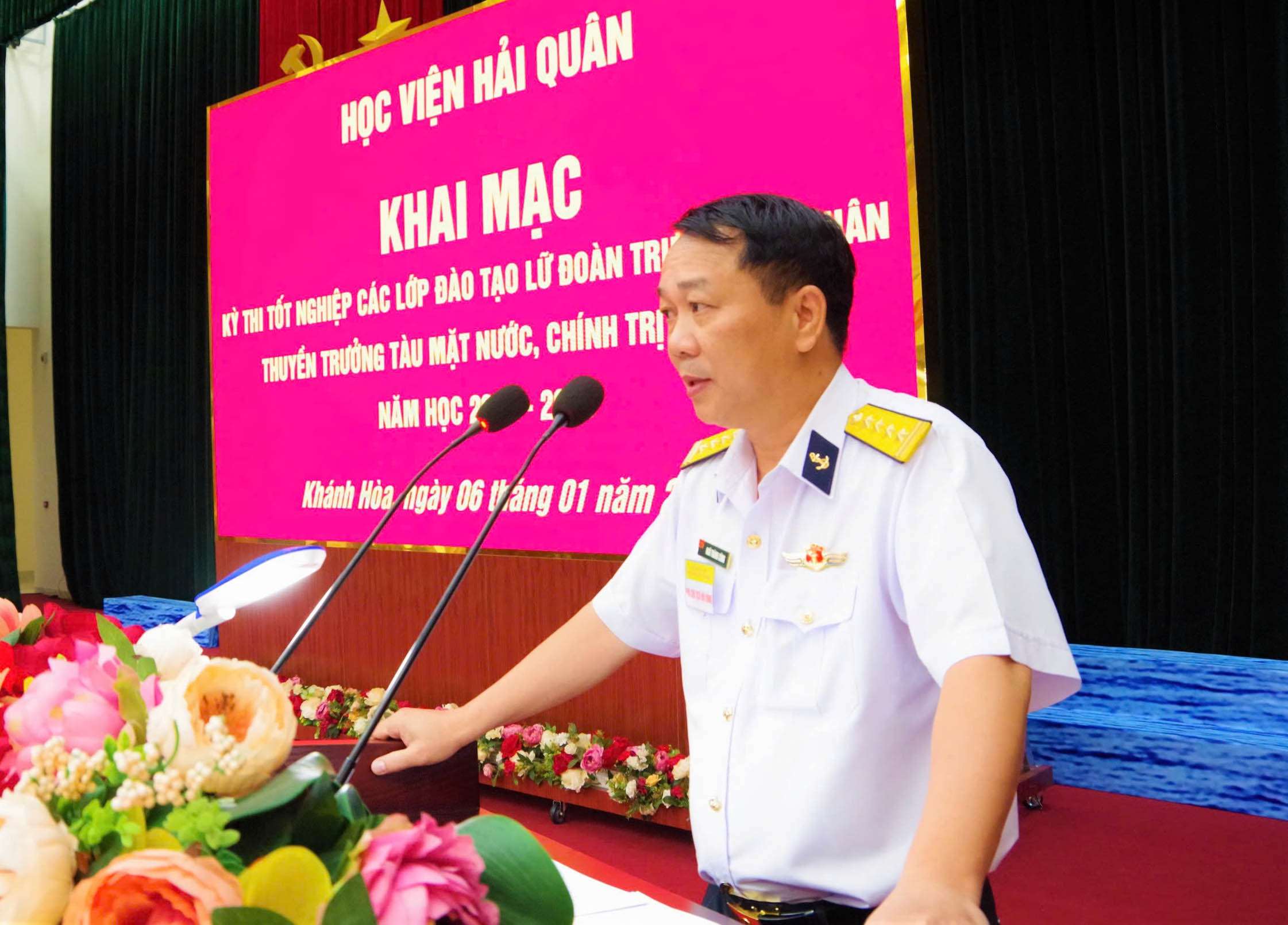 Chiều 6/1, tại TP. Nha Trang, tỉnh Khánh Hòa, Học viện Hải quân tổ chức khai mạc kỳ thi tốt nghiệp các lớp đào tạo lữ đoàn trưởng hải quân khóa 33, thuyền trưởng tàu mặt nước khóa 24, chính trị viên tàu khóa 30, năm học 2024 - 2025. Đại tá, PGS, TS Ngô Thành Công, Phó Giám đốc Học viện chủ trì.