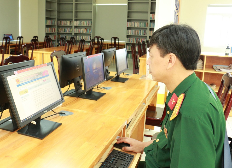 Đoàn kiểm tra hệ thống máy móc chuẩn bị cho Hội thi cán bộ, nhân viên thư viện số dùng chung trong Bộ Quốc phòng năm 2022