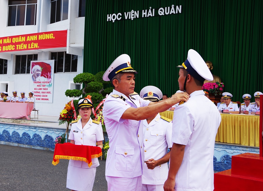 Chuẩn Đô đốc Lương Việt Hùng gắn quân hàm sĩ quan cho học viên tốt nghiệp loại giỏi