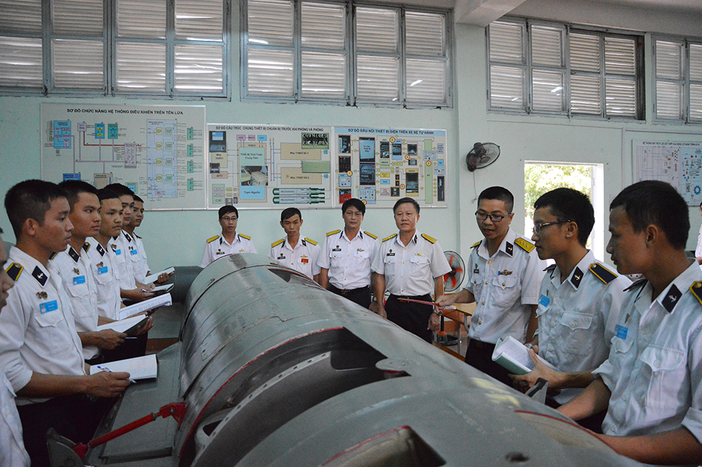 Đại tá Nguyễn Văn Lâm, Giám đốc Học viện (người thứ tư bên phải sang) kiểm tra huấn luyện tại Khoa Tên lửa-Pháo tàu