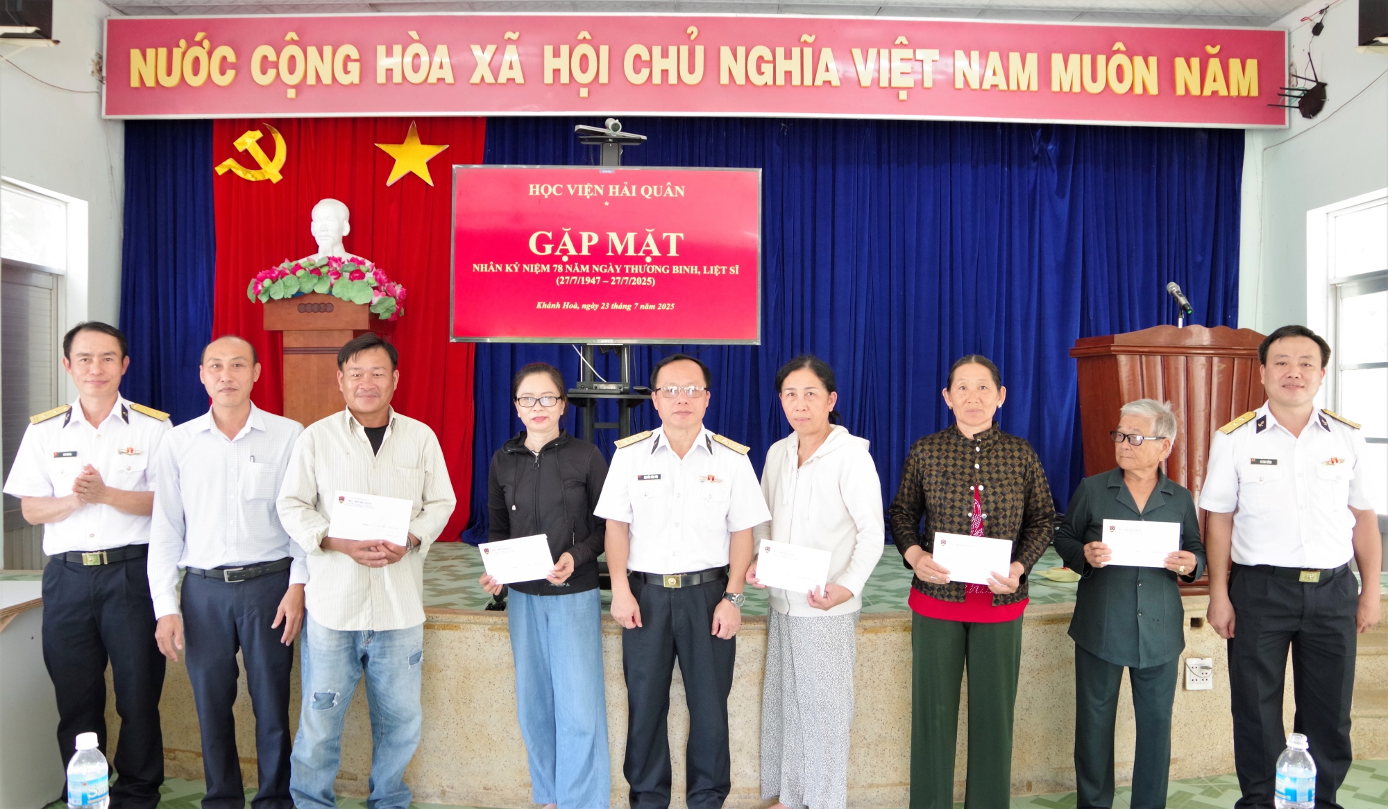 Dịp này, Học viện Hải quân tổ chức gặp mặt, trao tặng quà của Quân chủng và Học viện cho 7 đồng chí thương binh và thân nhân liệt sĩ đang công tác tại đơn vị; thăm hỏi, tặng quà cho 2 Anh hùng lực lượng vũ trang nhân dân; hỗ trợ quân nhân xây nhà đồng đội, tổng trị giá 144 triệu đồng; tặng 10 phần quà cho các gia đình chính sách là người dân tộc thiểu số tại xã Trung Khánh Vĩnh, tỉnh Khánh Hòa, trị giá 5 triệu đồng.