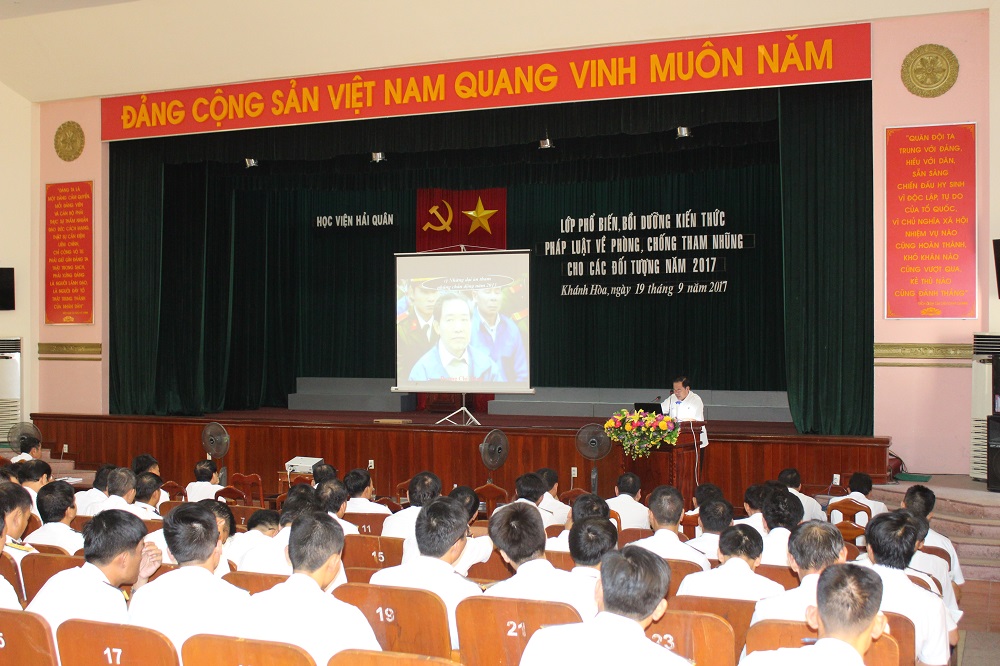 Ngày 19-9, tại TP.Nha Trang, tỉnh Khánh Hòa, Học viện Hải quân phối hợp với Tòa án Quân sự khu vực 2, Quân khu 5 và Đoàn luật sư tỉnh Khánh Hòa tổ chức phổ biến, bồi dưỡng kiến thức pháp luật về phòng, chống tham nhũng cho các đối tượng trong Học viện.