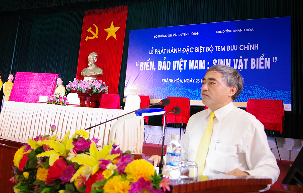 Phát biểu tại lễ phát hành, đồng chí Nguyễn Minh Hồng, Thứ trưởng Bộ Thông tin và Truyền thông đánh giá cao vai trò của biển, đảo Việt Nam đồng thời khẳng định việc phát hành bộ tem về biển, đảo sẽ trực tiếp góp phần tuyên tuyền, giáo dục sâu rộng trong mọi tầng lớp nhân dân về ý thức, trách nhiệm đối với nhiệm vụ bảo vệ chủ quyền biển, đảo và nguồn tài nguyên phong phú từ biển. Đồng chí Thứ trưởng cảm ơn Học viện Hải quân, Vùng 4 Hải quân đã tạo điều kiện thuận lợi để Bộ Thông tin và Truyền thông-UBND tỉnh Khánh Hòa tổ chức lễ phát hành và triển lãm bộ tem về biển, đảo Việt Nam trang trọng, ý nghĩa; bảo đảm hiệu quả giáo dục, tuyên tuyền.
