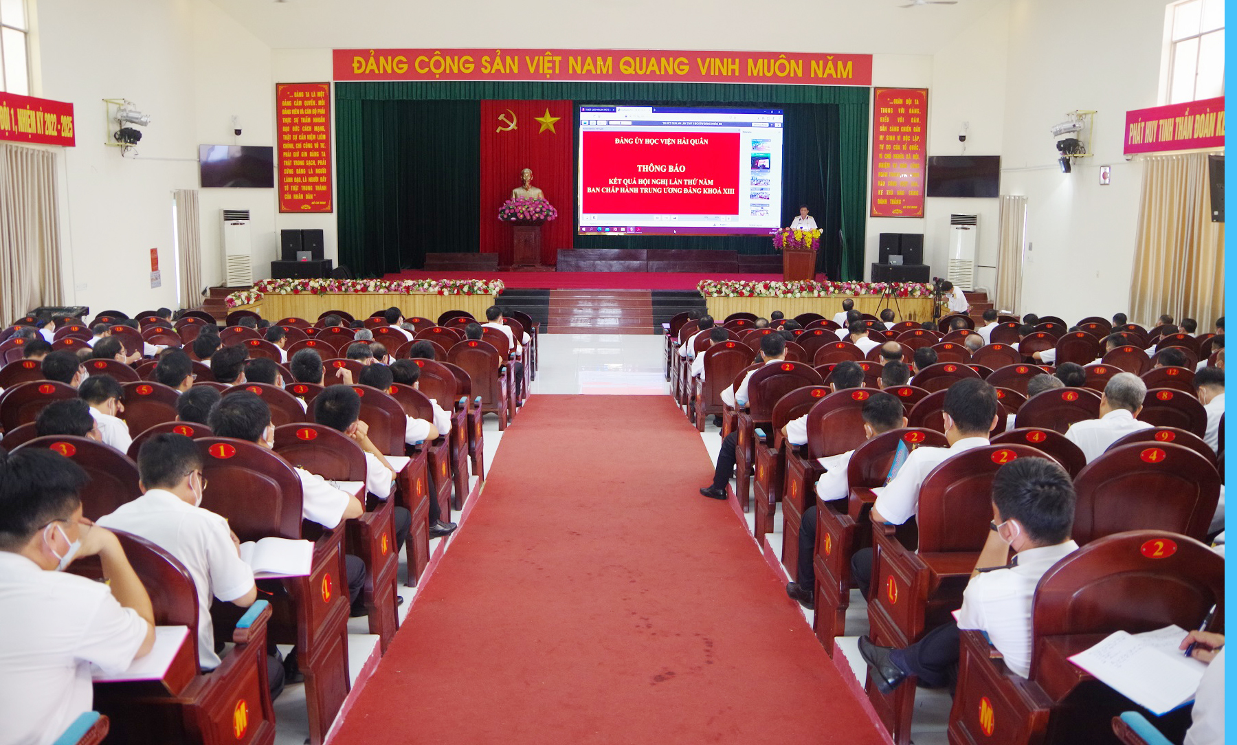 Chiều 25/5, tại TP. Nha Trang, tỉnh Khánh Hòa, Đảng ủy, Học viện Hải quân tổ chức thông báo kết quả Hội nghị lần thứ 5, Ban Chấp hành Trung ương Đảng Khóa XIII cho hơn 900 cán bộ, giảng viên, học viên và quân nhân chuyên nghiệp. Hội nghị được trực tuyến tới 5 điểm cầu trong toàn Học viện.