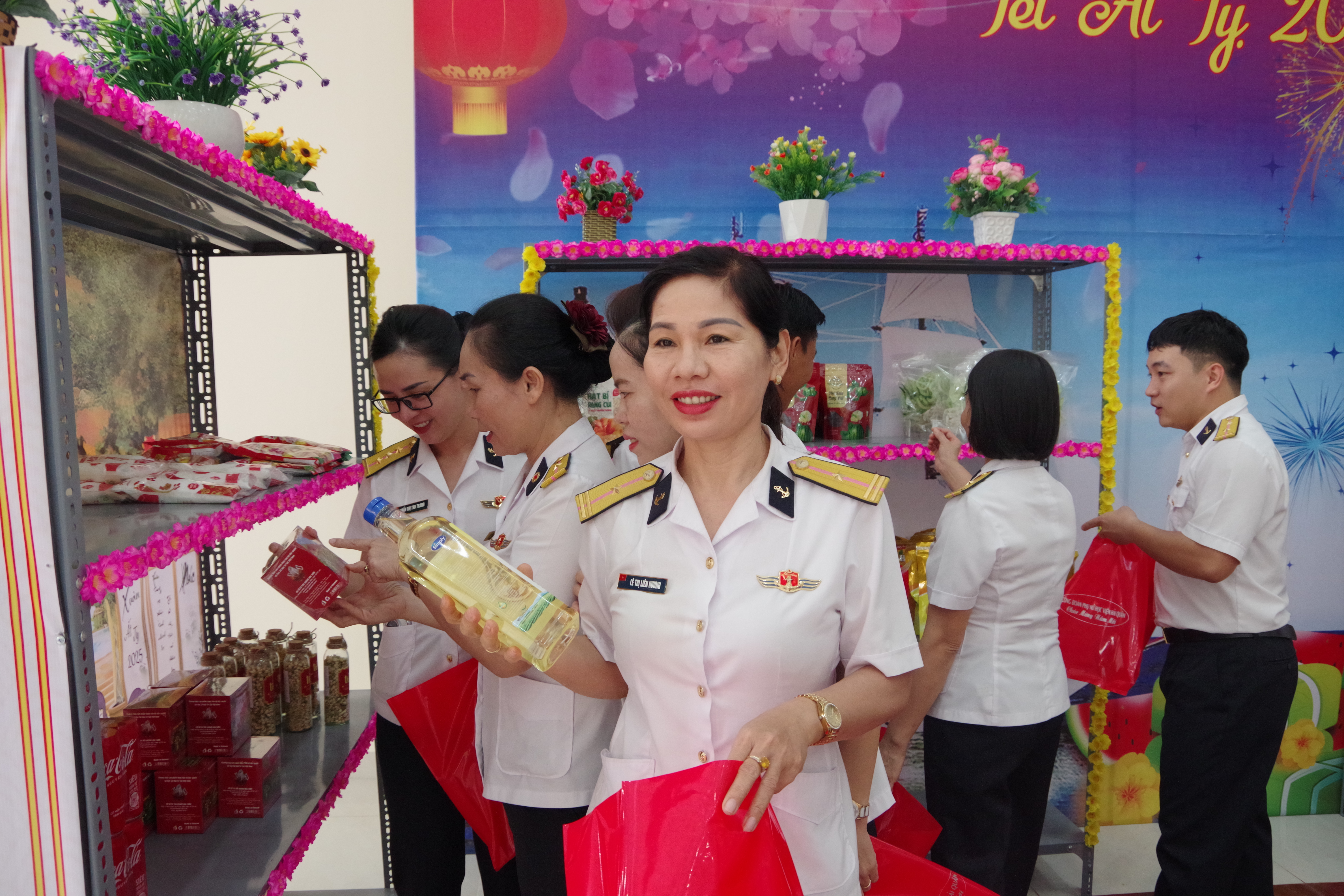Thượng tá Nguyễn Thị Minh Châu, Chủ tịch Công đoàn cơ sở Học viện Hải quân chia sẻ: Gian hàng 0 đồng" là món quà ý nghĩa nhằm động viên tinh thần và chia sẻ khó khăn với đoàn viên công đoàn. Chúng tôi mong muốn mang lại một mùa tết đong đầy yêu thương và hạnh phúc cho mọi người.