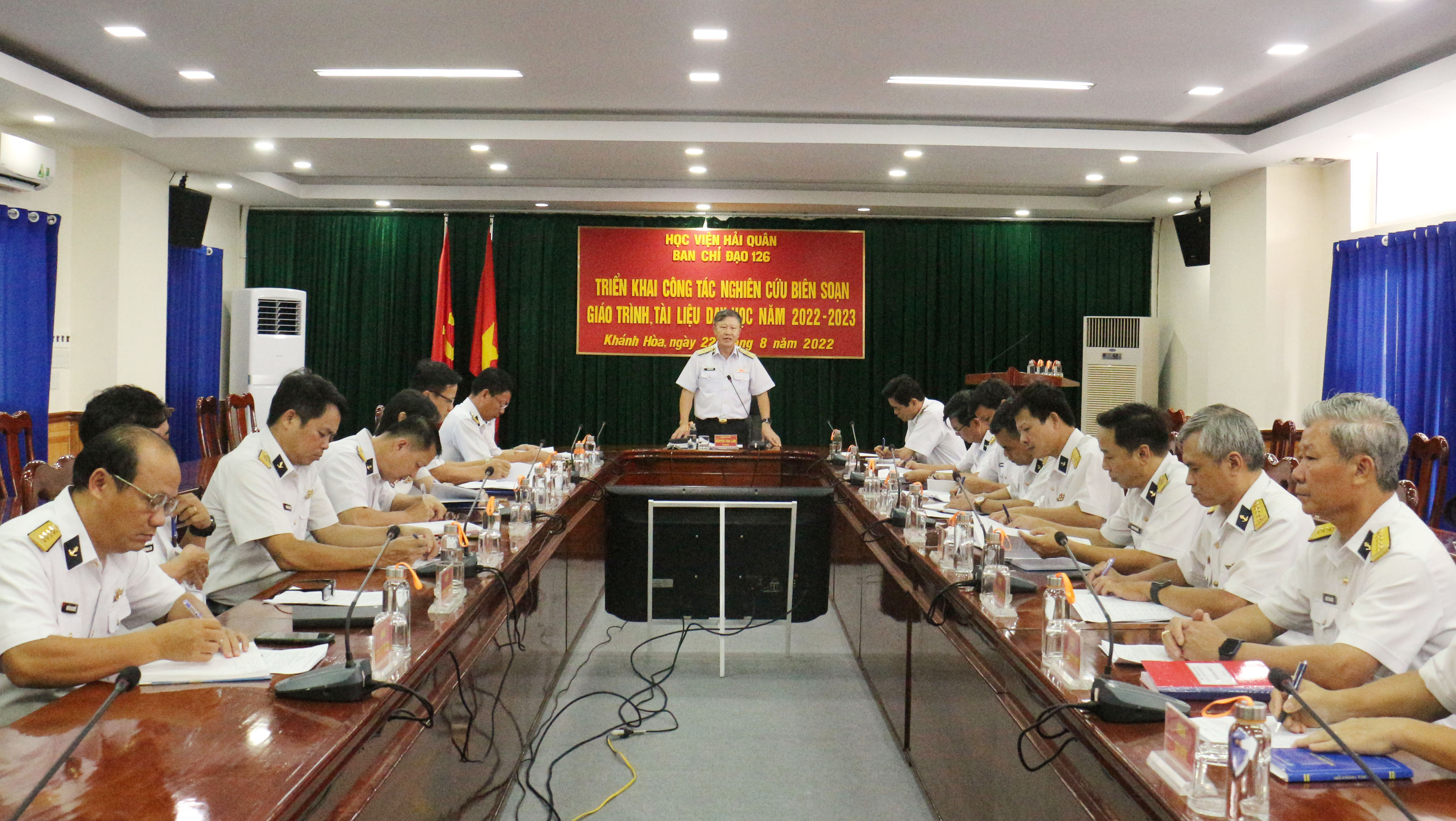 Chiều 22/8, tai TP. Nha Trang, tỉnh Khánh Hòa, Ban chỉ đạo 126 Học viện Hải quân tổ chức triển khai công tác nghiên cứu, biên soạn giáo trình, tài liệu dạy học năm học 2022-2023. Chuẩn Đô đốc, PGS, TS Nguyễn Văn Lâm, Giám đốc Học viện, Trưởng ban chỉ đạo chủ trì. Cùng dự có Chuẩn Đô đốc Chu Ngọc Sáng, Bí thư Đảng ủy, Chính ủy Học viện, Phó trưởng ban chỉ đạo; các thành viên Ban chỉ đạo và đại diện thủ trưởng các khoa.