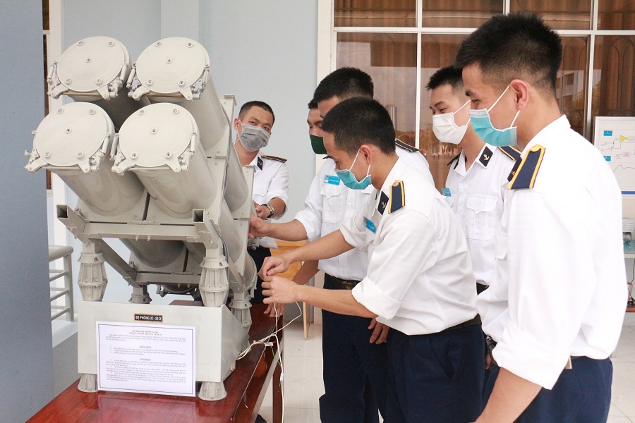 Học viên kiểm tra mô hình bệ phóng tên lửa trên tàu Hải quân
