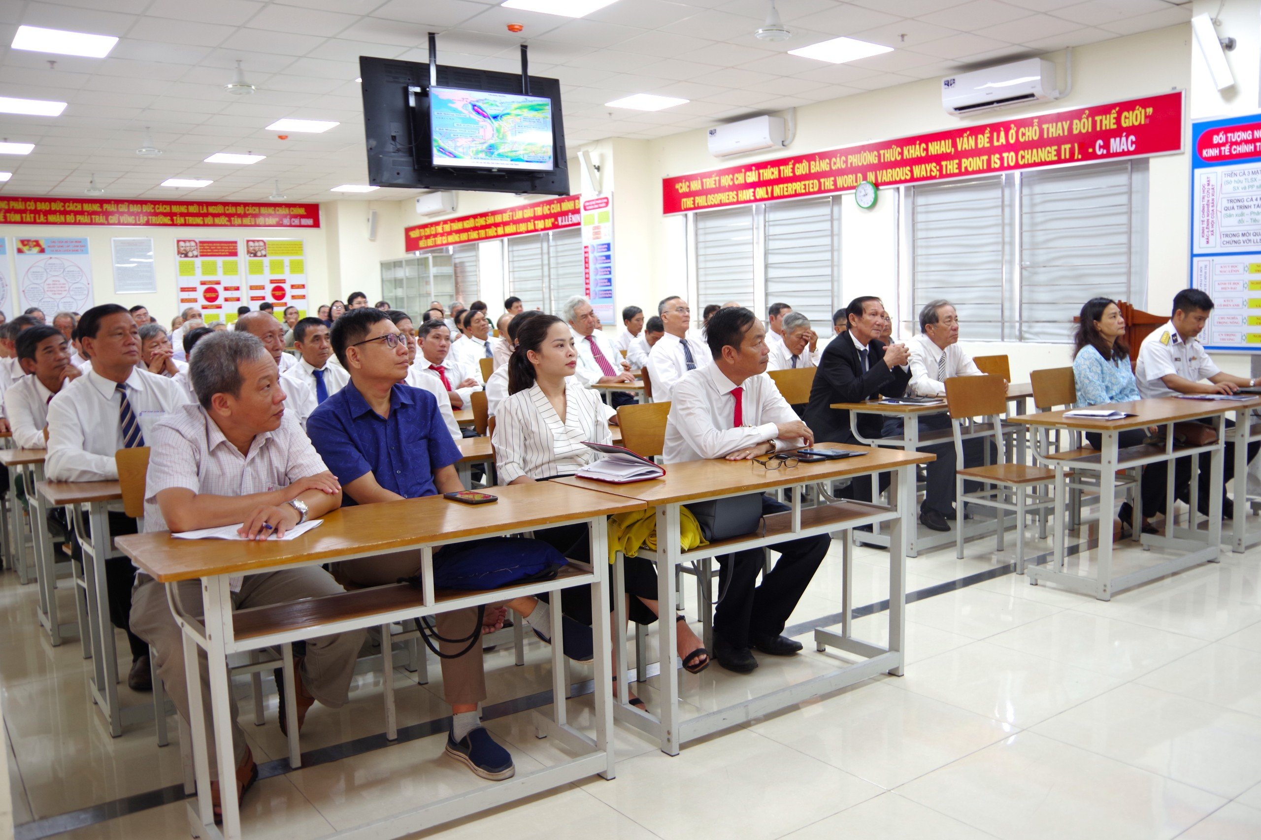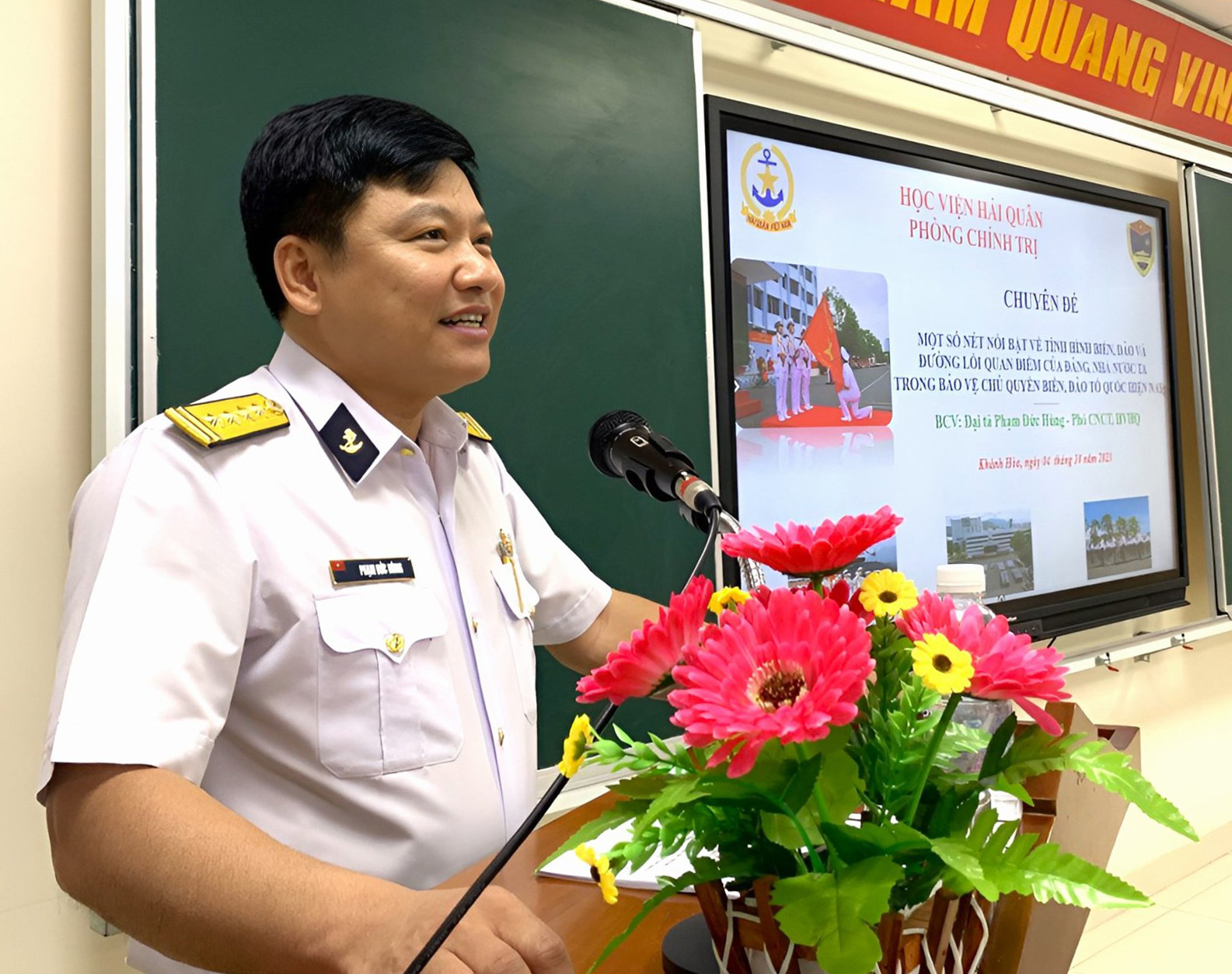 Đại tá Phạm Đức Hùng, Phó Chủ nhiệm Chính trị Học viện Hải quân thông tin tới các đại biểu về tình hình thế giới, khu vực, trong nước, tình hình Biển Đông 9 tháng năm 2023; đường lối, quan điểm của Đảng và Nhà nước ta trong bảo vệ chủ quyền biển đảo của Tổ quốc; kết quả thực hiện nhiệm vụ chính trị trọng tâm và xây dựng Quân chủng Hải quân cách mạng, chính quy, tinh nhuệ, hiện đại, đáp ứng yêu cầu nhiệm vụ trong tình hình mới.
