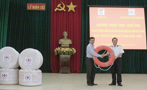 Chiều 19-4, đoàn công tác Hội Chữ thập đỏ tỉnh Khánh Hòa đã đến thăm, giao lưu và trao tặng cán bộ, chiến sĩ Lữ đoàn 162, Vùng 4 Hải quân 150 phao tròn cứu sinh.