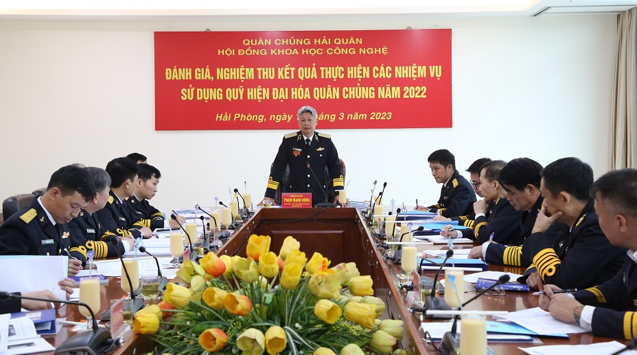 Sáng 16/3, tại Hải Phòng, Hội đồng Khoa học công nghệ Quân chủng Hải quân tổ chức đánh giá, nghiệm thu kết quả thực hiện các nhiệm vụ sử dụng quỹ hiện đại hóa Quân chủng năm 2022. Chuẩn Đô đốc Phạm Mạnh Hùng, Phó Tư lệnh, Tham mưu trưởng Hải quân, Chủ tịch Hội đồng chủ trì.