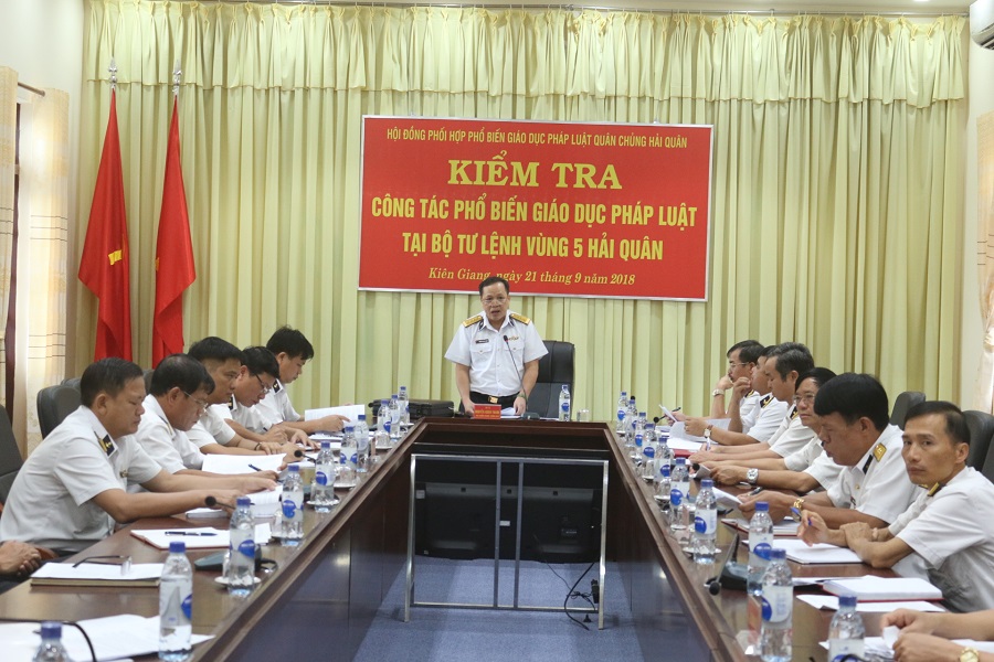 Ngày 21-9, tại huyện đảo Phú Quốc, tỉnh Kiên Giang, đoàn công tác của Hội đồng phối hợp phổ biến giáo dục pháp luật Quân chủng do Đại tá Nguyễn Xuân Thanh, Viện trưởng Viện Kiểm sát quân sự Quân chủng Hải quân làm trưởng đoàn đã đến kiểm tra công tác phổ biến, giáo dục pháp luật và tổ chức thi tìm hiểu pháp luật tại Vùng 5 Hải quân.
