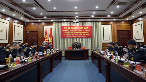 Thượng tướng Đỗ Căn, Phó Chủ nhiệm Tổng cục Chính trị Quân đội Nhân dân Việt Nam dự, chủ trì tại điểm cầu Quân ủy Trung ương, Bộ Quốc phòng. Toàn quân có 52 điểm cầu trực tuyến với 3.148 đại biểu tham dự.