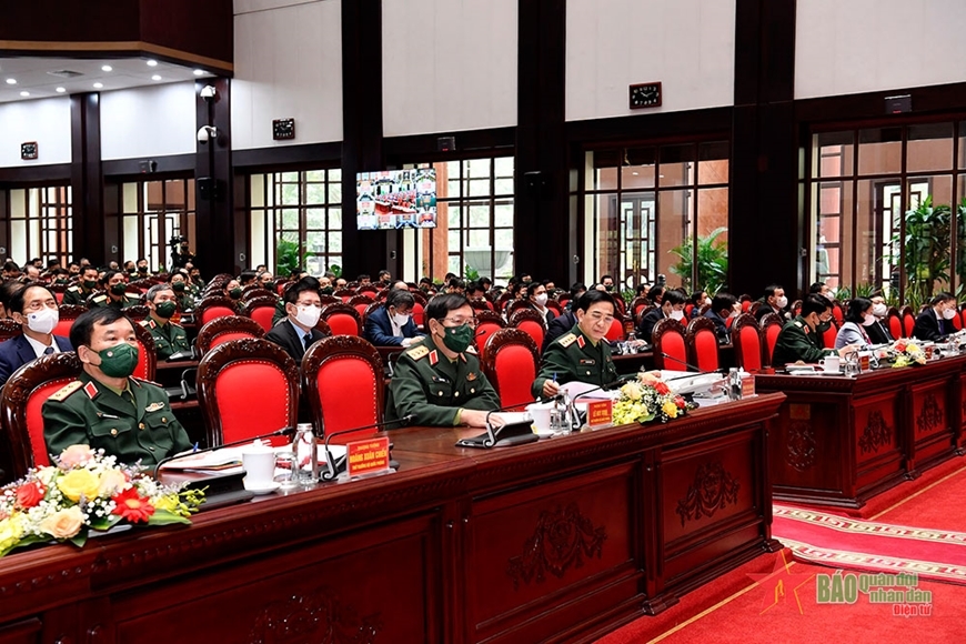 Đồng chí Bộ trưởng Bộ Quốc phòng nhấn mạnh, trong năm 2022, toàn quân cần nêu cao tinh thần đoàn kết, quyết tâm, chủ động, sáng tạo, tiếp tục quán triệt, cụ thể hóa, triển khai thực hiện sâu rộng Nghị quyết Đại hội XIII của Đảng, Nghị quyết Đại hội Đảng bộ Quân đội lần thứ XI, tạo bước đột phá mạnh mẽ. Cần chủ động nghiên cứu, nâng cao năng lực dự báo, tham mưu chiến lược với Đảng, Nhà nước, có chủ trương, đối sách xử lý thắng lợi các tình huống, không để bị động bất ngờ. Phối hợp chặt chẽ với các ban, bộ, ngành Trung ương và địa phương triển khai thực hiện có hiệu quả các chiến lược, nghị quyết, kết luận của Đảng và hệ thống pháp luật về QS, QP. Phát huy sức mạnh tổng hợp, huy động các nguồn lực, xây dựng, củng cố nền quốc phòng toàn dân; nâng cao chất lượng hoạt động khu vực phòng thủ và hoạt động của lực lượng dân quân tự vệ, dự bị động viên. Tiếp tục nâng cao chất lượng tổng hợp, sức mạnh chiến đấu của quân đội, duy trì nghiêm chế độ trực SSCĐ, quản lý chặt chẽ vùng trời, vùng biển, biên giới và các địa bàn trọng điểm; xử lý có hiệu quả các tình huống, không để bị động bất ngờ; tiếp tục bổ sung, hoàn chỉnh hệ thống văn kiện tác chiến.