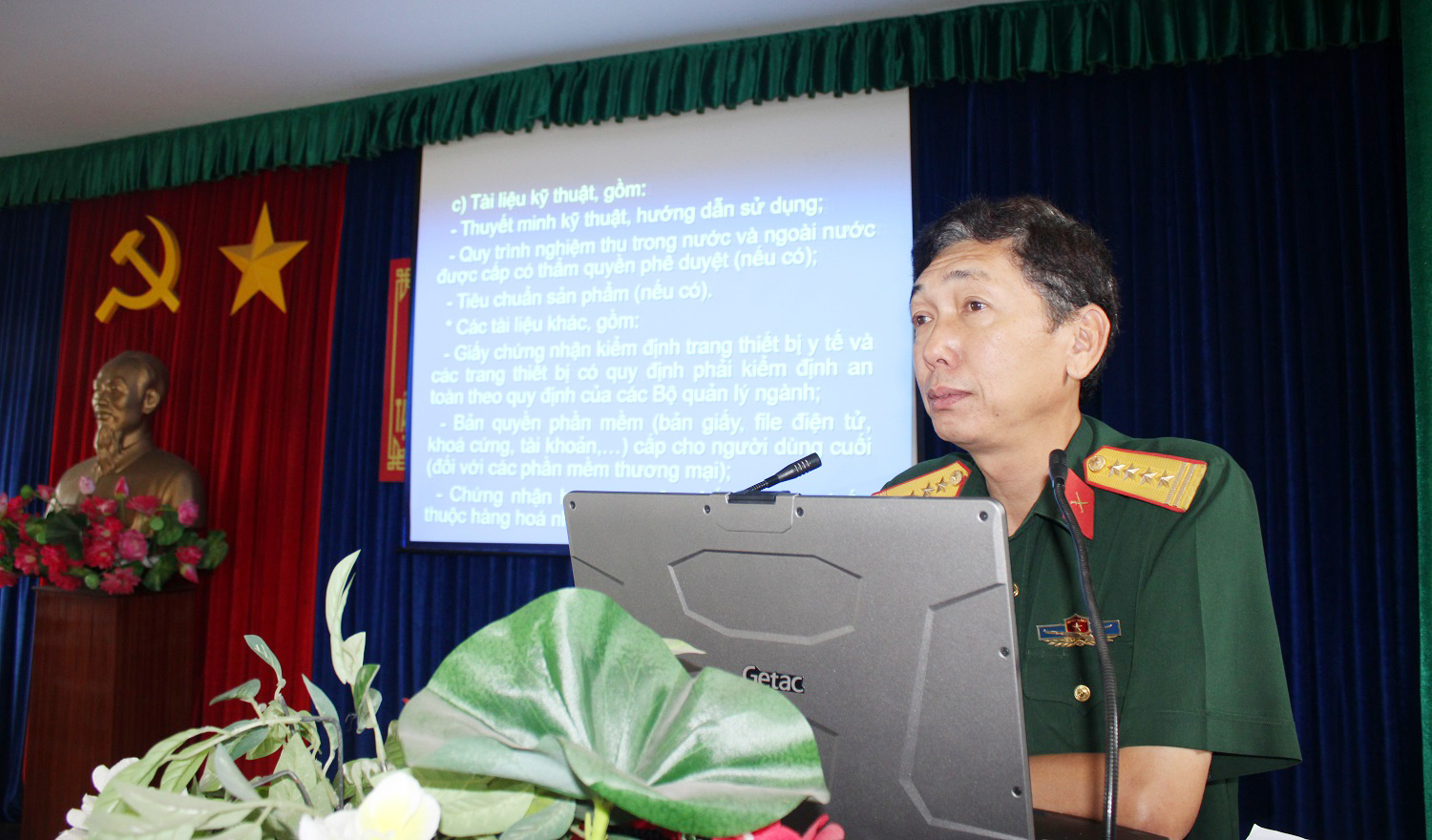 Đại tá Nguyễn Thế Phong, Phó trưởng phòng Quản lý chất lượng, Cục TC-ĐL-CL, Bộ Tổng Tham mưu truyền đạt nội dung tập huấn