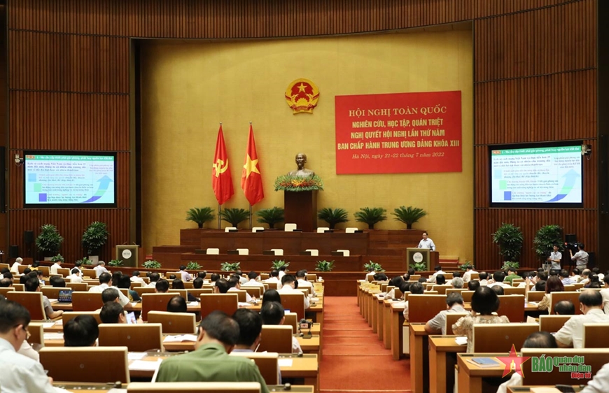 Sáng 21/7, Bộ Chính trị, Ban Bí thư tổ chức Hội nghị toàn quốc nghiên cứu, học tập, quán triệt Nghị quyết Hội nghị lần thứ 5 Ban Chấp hành Trung ương Đảng Khóa XIII. Hội nghị tổ chức trực tiếp tại Hội trường Diên Hồng, Tòa nhà Quốc hội (Thủ đô Hà Nội) và trực tuyến đến các điểm cầu trong cả nước.
