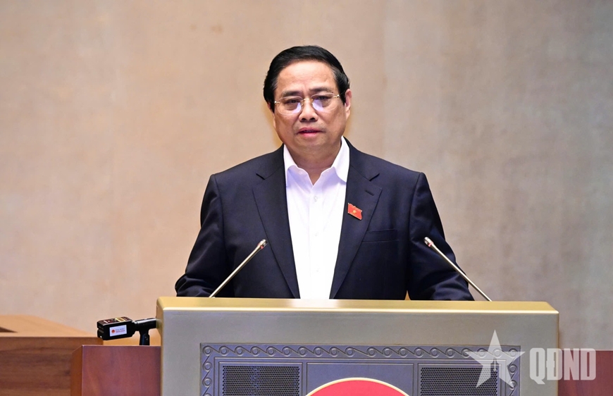 Thủ tướng Chính phủ Phạm Minh Chính quán triệt nội dung Nghị quyết 68-NQ/TW của Bộ Chính trị về phát triển kinh tế tư nhân tại hội nghị. Ảnh: QĐND