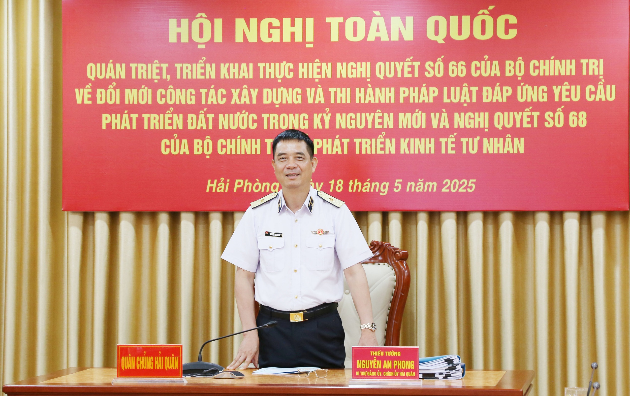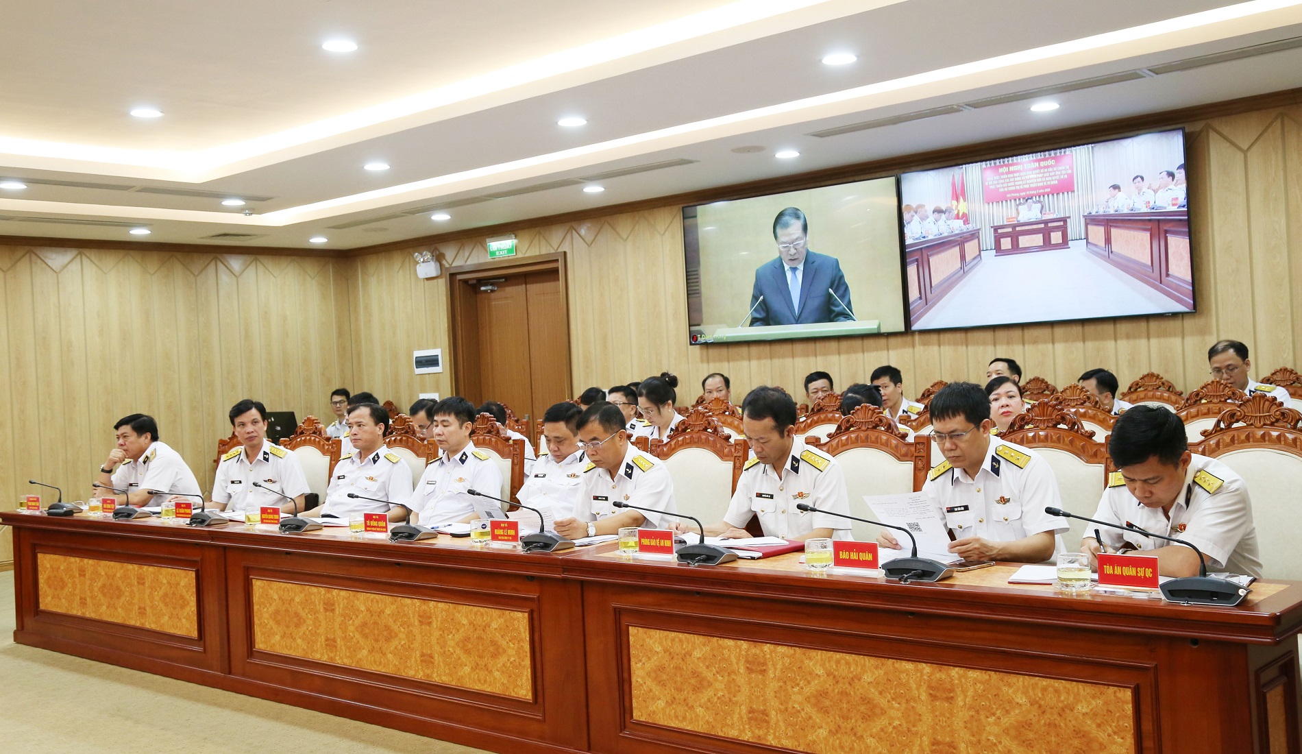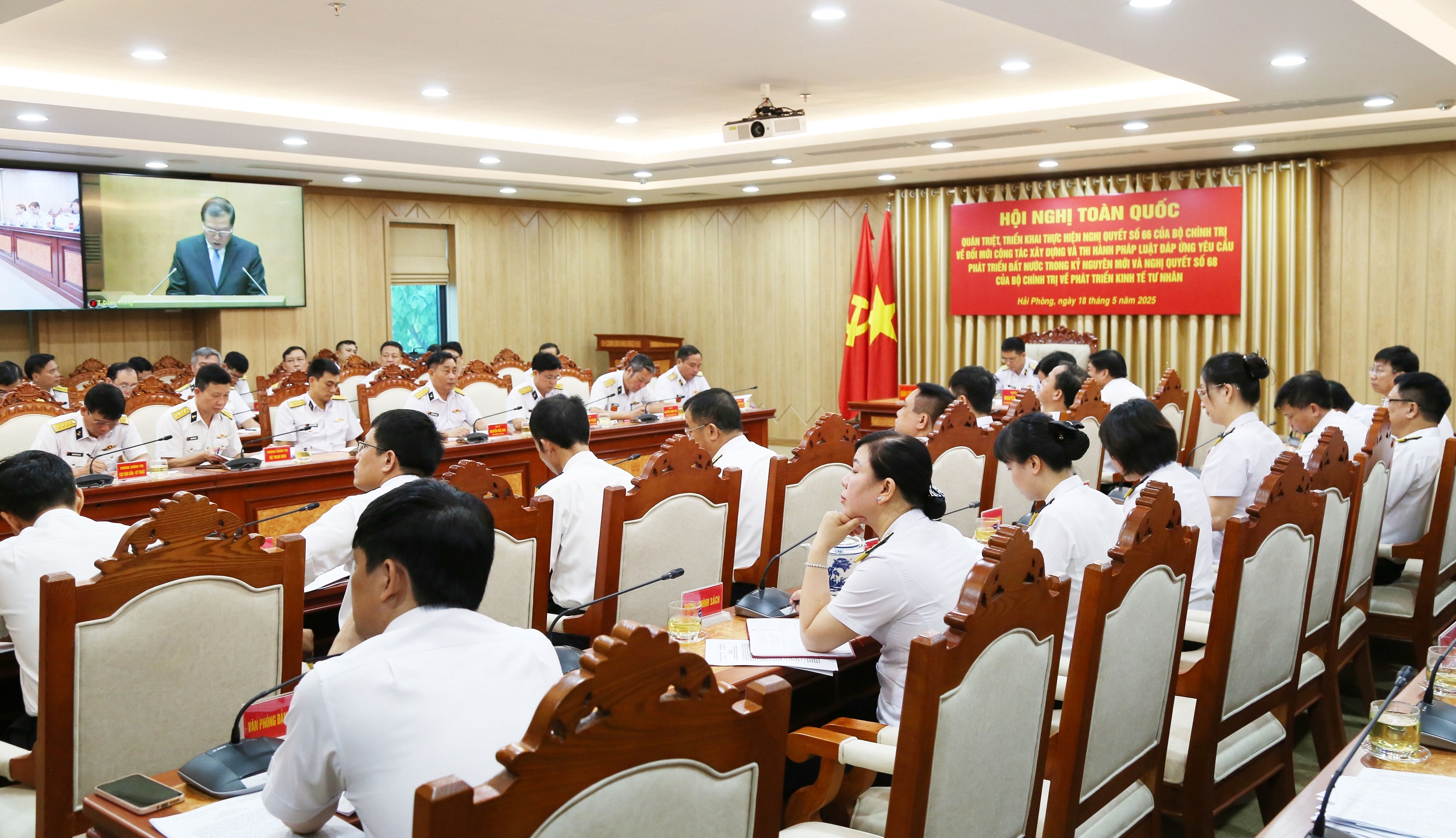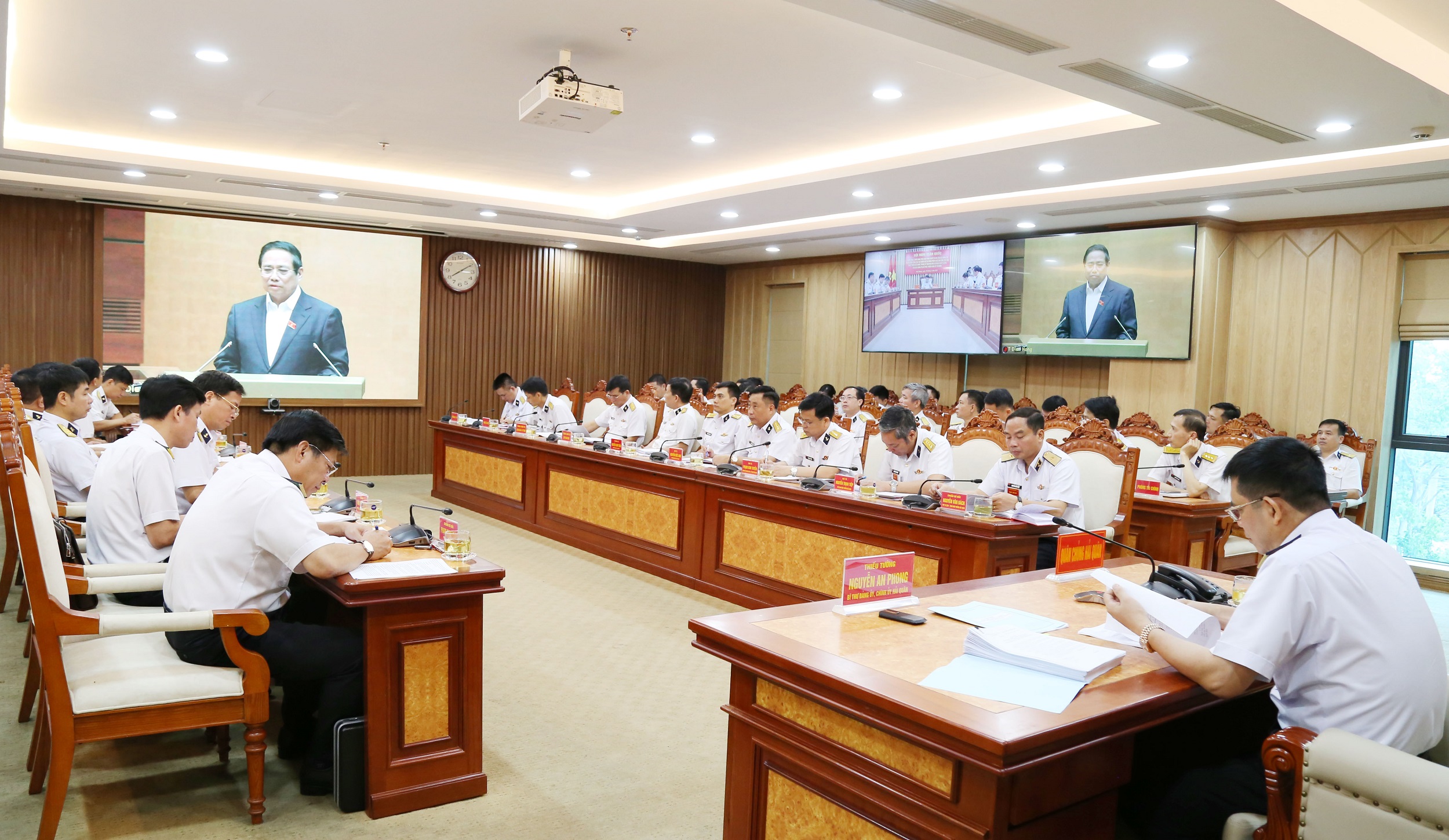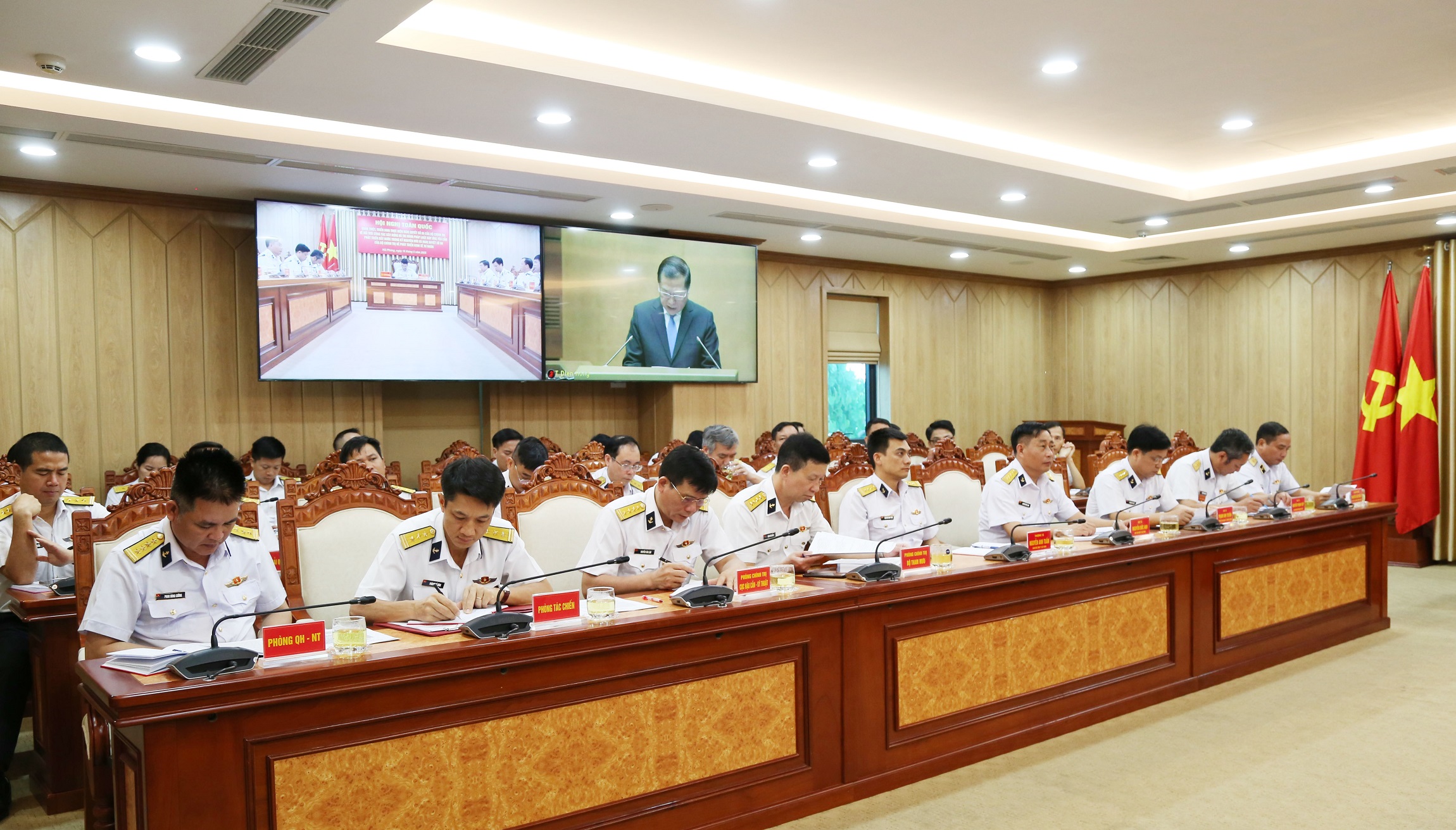 Dự hội nghị tại điểm cầu Bộ Tư lệnh Hải quân (Hải Phòng) có Thiếu tướng Nguyễn An Phong, Bí thư Đảng ủy, Chính ủy Hải quân; Chuẩn Đô đốc Nguyễn Văn Bách, Phó Tư lệnh, Tham mưu trưởng Hải quân; Chuẩn Đô đốc Phạm Minh Tuấn, Phó Tư lệnh Hải quân cùng đại biểu một số cơ quan, đơn vị khu vực Hải Phòng.