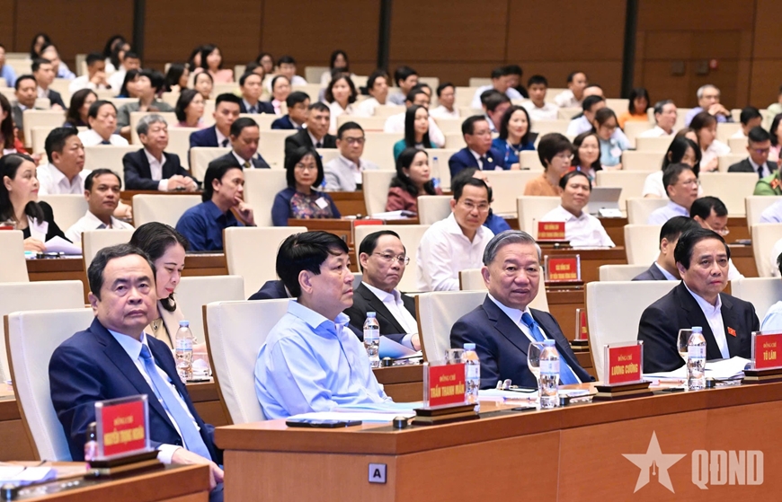 Tổng Bí thư Tô Lâm, Chủ tịch nước Lương Cường, Thủ tướng Chính phủ Phạm Minh Chính, Chủ tịch Quốc hội Trần Thanh Mẫn và các đại biểu dự hội nghị. Ảnh: QĐND