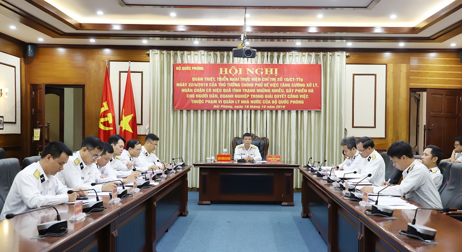 Sáng 18-10, tại Hà Nội, Bộ Quốc phòng tổ chức Hội nghị trực tuyến tại 96 điểm cầu trong toàn quân về phổ biến, quán triệt Chỉ thị số 10/CT-TTg ngày 22-4-2019 của Thủ tướng Chính phủ "Về việc tăng cường xử lý, ngăn chặn có hiệu quả tình trạng nhũng nhiễu, gây phiền hà cho người dân, doanh nghiệp trong giải quyết công việc thuộc phạm vi quản lý nhà nước của Bộ Quốc phòng". Thượng tướng Lê Chiêm, Thứ trưởng Bộ Quốc phòng chủ trì. Tham dự có hơn 1.000 đại biểu tại các điểm cầu.