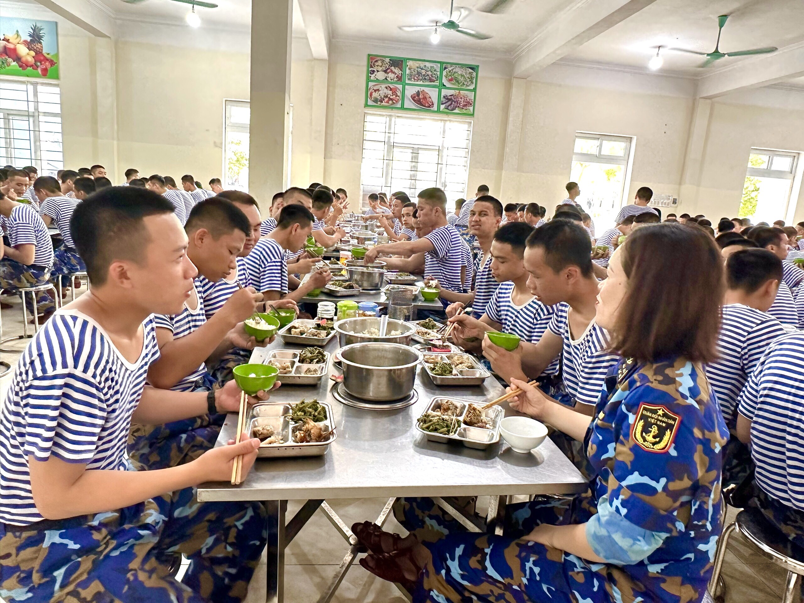 Đến giờ ăn cơm, các chiến sĩ xếp hàng ngay ngắn vào các vị trí ăn theo quy định. Các chiến sĩ nhiệt tình ăn hết phần ăn của mình một cách ngon miệng. Binh nhì Bùi Duy Tùng, Trung đội 1, Đại đội 1 chia sẻ: Sau khi huấn luyện trên thao trường hành quân về đơn vị đã đói bụng nên tôi ăn cơm rất ngon, nhà bếp luôn thay đổi món ăn nên rất hợp khẩu vị của tôi. Từ khi vào đơn vị tôi đã tăng 4 cân.