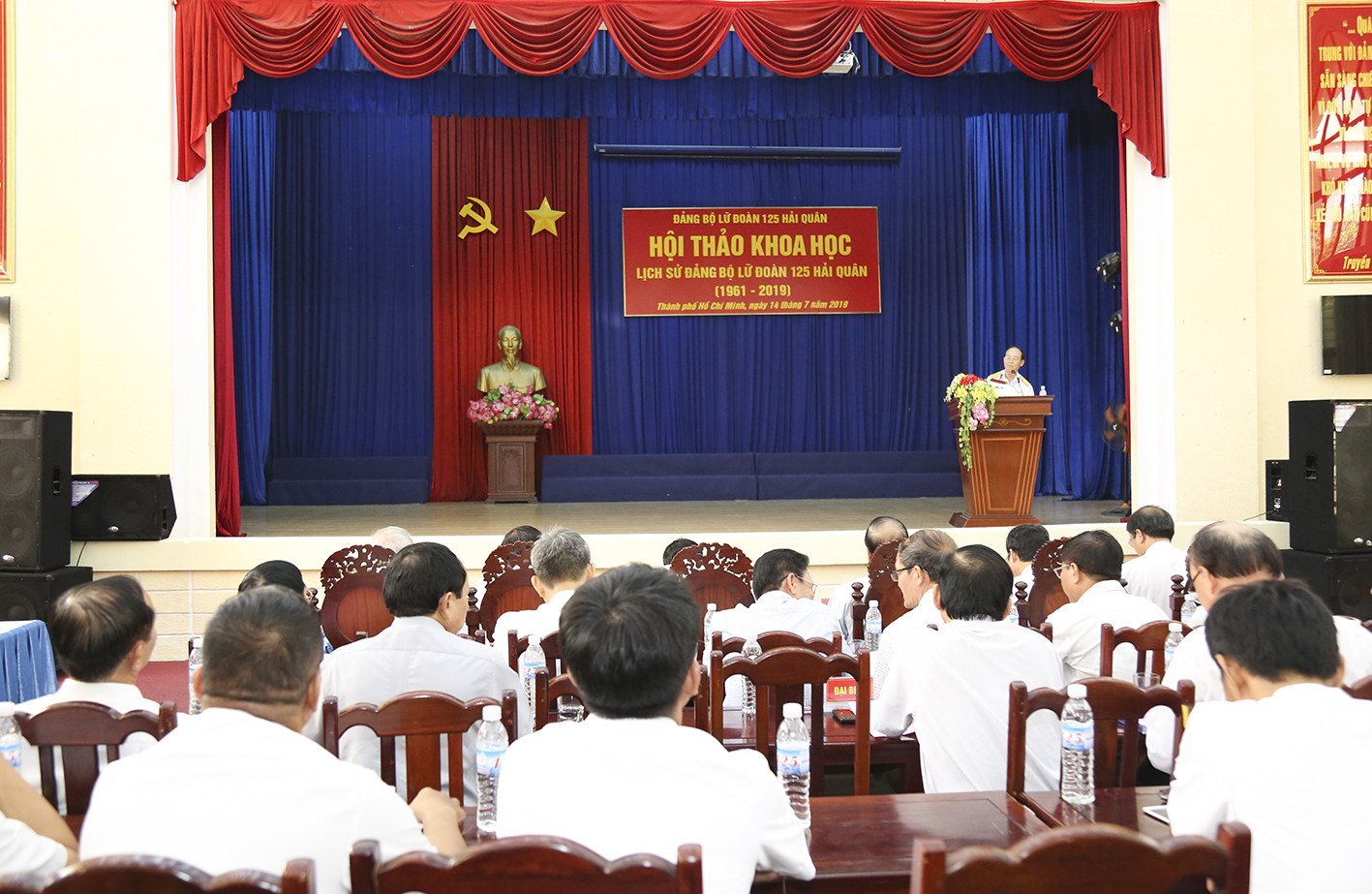 Sáng 14-7, tại TP Hồ Chí Minh, Lữ đoàn 125, Vùng 2 Hảỉ quân tổ chức Hội thảo khoa học: Lịch sử Đảng bộ Lữ đoàn 125 Hải quân (1961 - 2019). Thượng tá Phạm Minh Chiến, Bí thư Đảng ủy, Chính ủy Lữ đoàn chủ trì.
