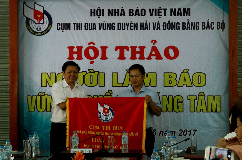 Đồng chí Bùi Thanh Long, Chủ tịch Hội Nhà báo Hải Phòng đã trao cờ luân lưu hội thảo cho đồng chí Đỗ Mạnh Hà, Phó Chủ tịch Hội Nhà báo tỉnh Quảng Ninh đăng cai hội thảo thời gian tiếp theo.