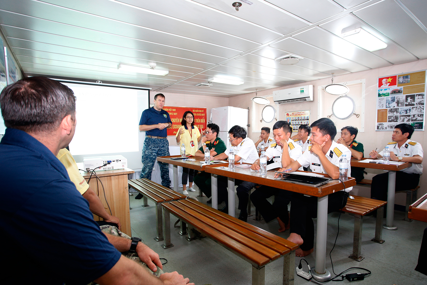 Trong hai ngày 9 và 10-5 các y, bác sĩ và chuyên gia y tế của Hải quân Việt Nam và Hoa Kỳ sẽ trao đổi chuyên môn, chia sẻ kinh nghiệm cấp cứu trên biển về các nội dung: Tổng quan về khả năng y tế tàu mặt nước Hoa Kỳ; các chấn thương thường gặp và phức tạp trên biển; y học dự phòng trên tàu; chương trình huấn luyện quân y trên tàu; cấp cứu hàng loạt và chu trình ưu tiên; tổ chức cấp cứu, chuyển thương trên biển của Hải quân Việt Nam.