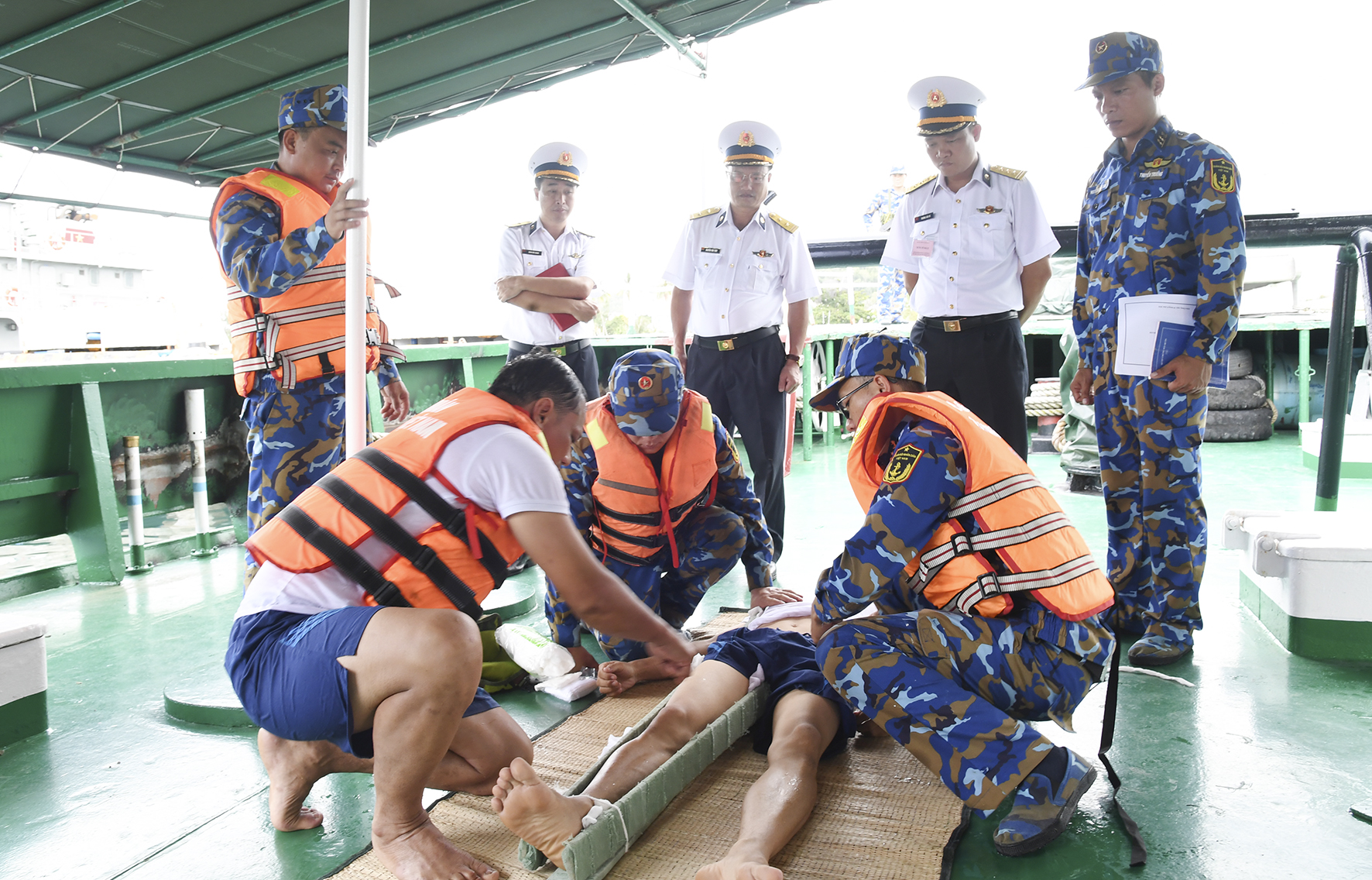 Cán bộ, chiến sĩ Tàu 945, Hải đội 511, Lữ đoàn 127, Vùng 5 thực hiện nội dung cứu người rơi xuống nước. Ảnh: Phúc Vinh