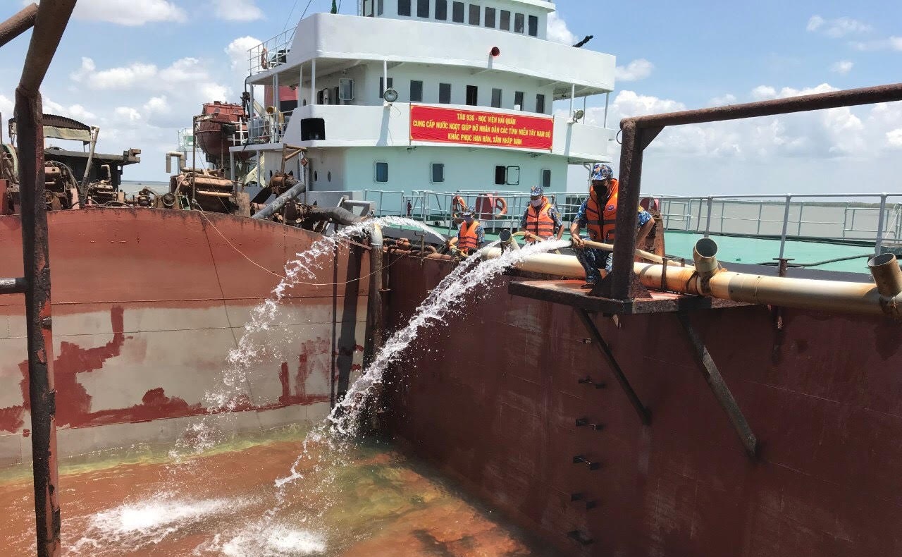 Ngày 2-4, tại phao số 22, luồng Soi Ráp, cán bộ, chiến sĩ Tàu 936 Học viện Hải quân đã phối hợp với Bộ đội Biên phòng Vàm Láng cấp hơn 1 triệu lít nước ngọt xuống sà lan để trung chuyển đến bà con nhân dân xã Kiểng Phước và thị trấn Vàm Láng, huyện Gò Công Đông, tỉnh Tiền Giang.