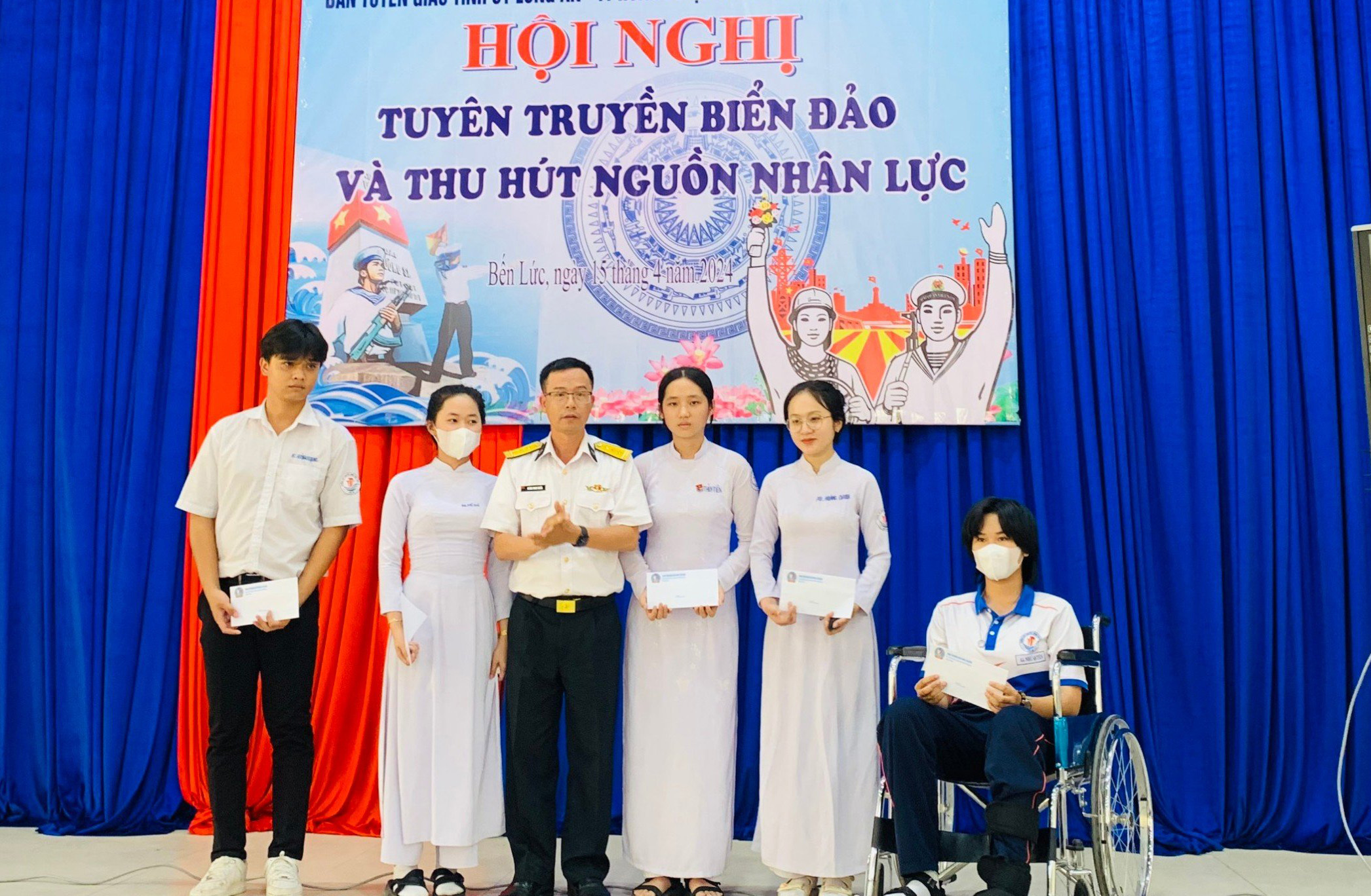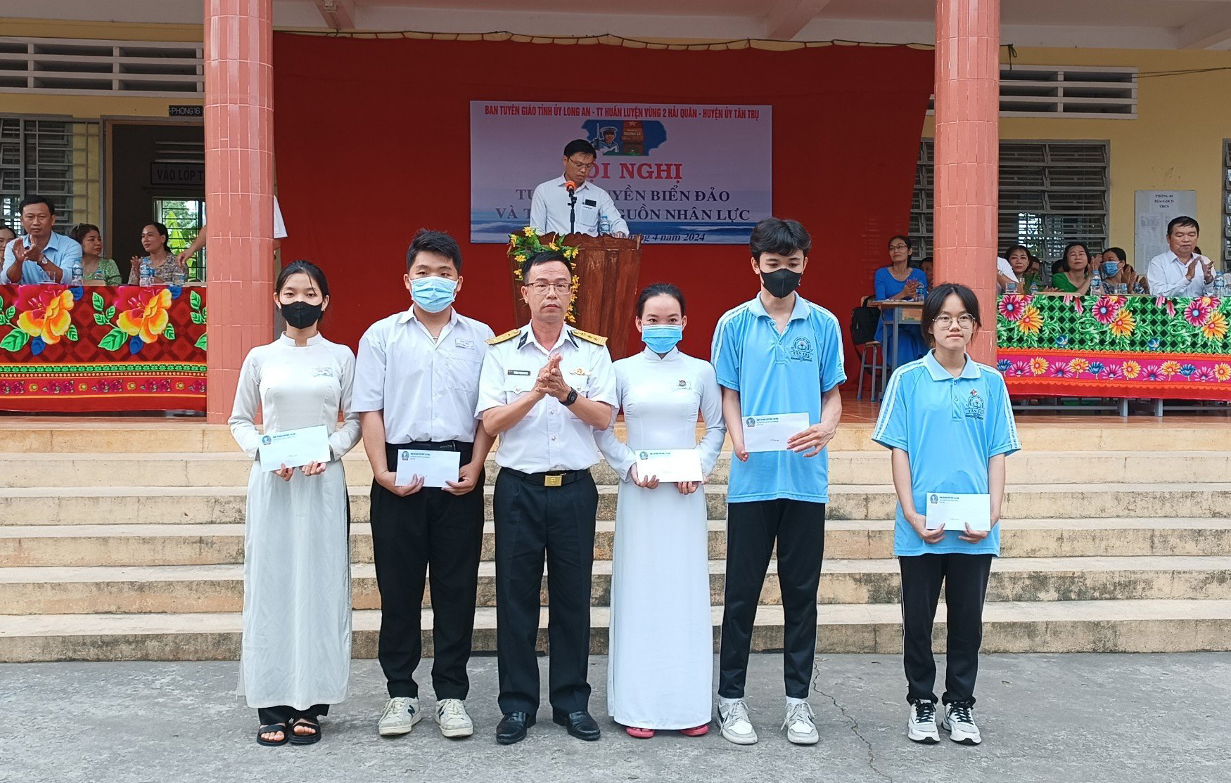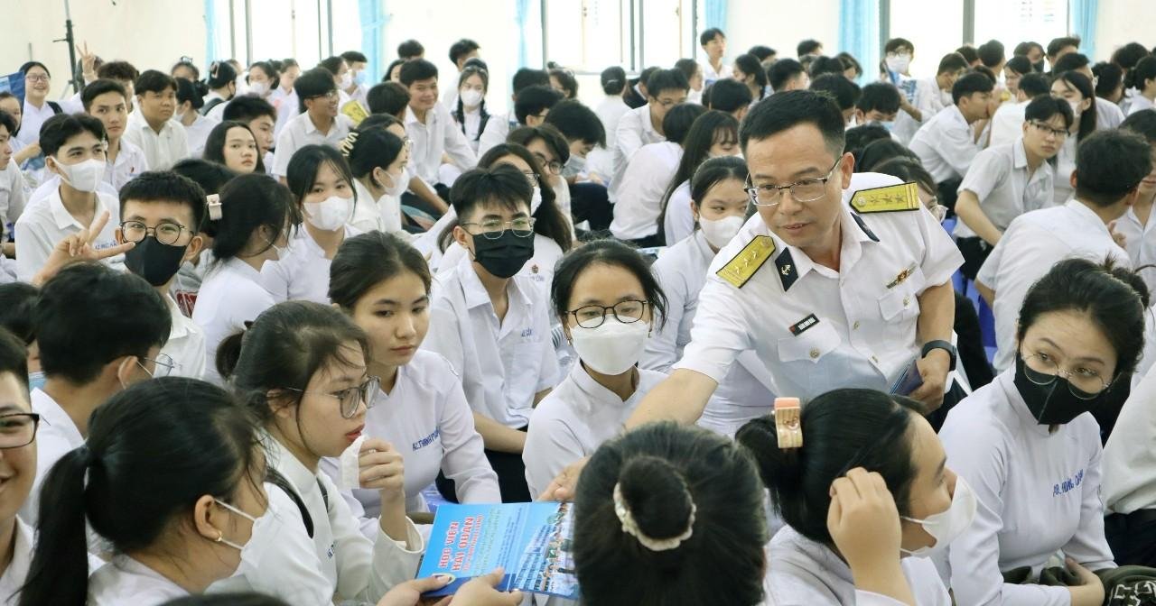 Cấp phát tài liệu tuyên truyền về Học viện Hải quân tới các học sinh
