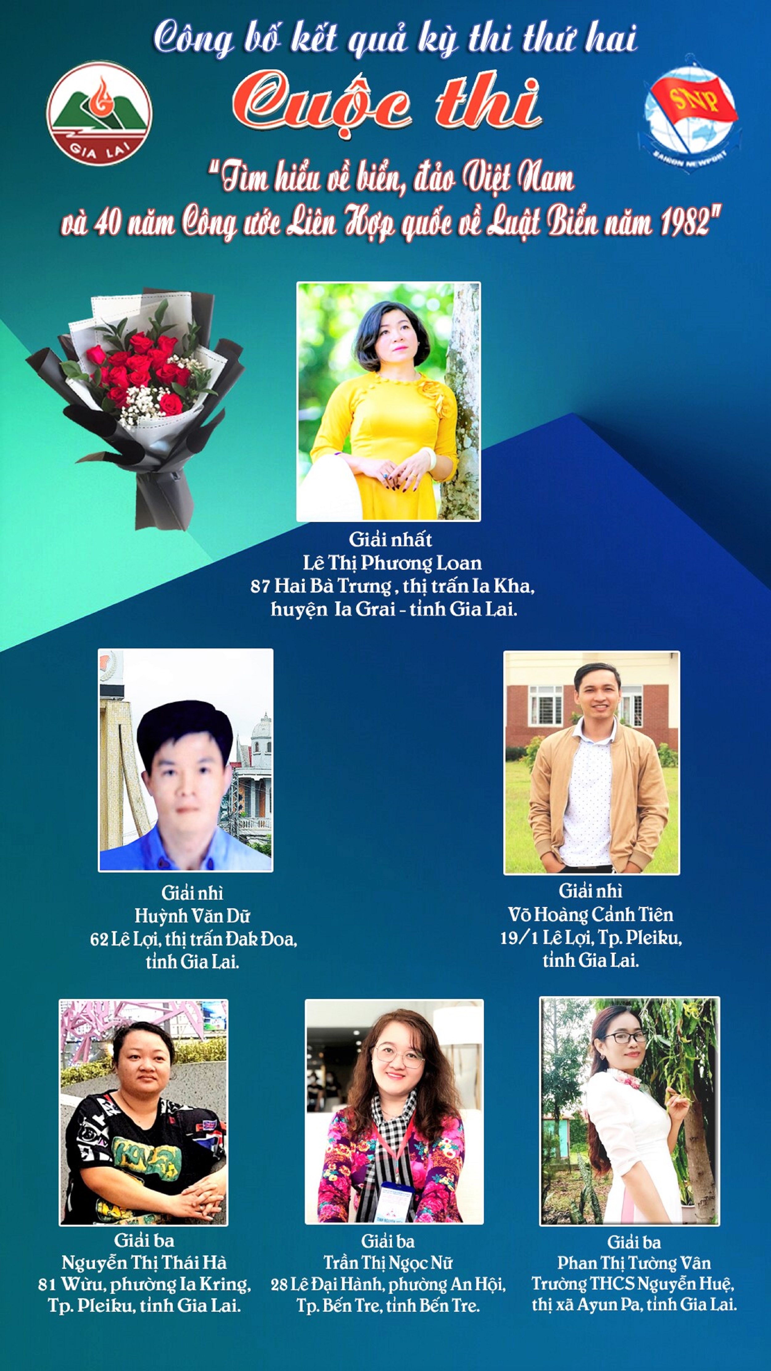 Giải Nhì: Huỳnh Văn Dữ, thị trấn Đak Đoa, huyện Đak Đoa, tỉnh Gia Lai và Võ Hoàng Cảnh Tiên, TP. Pleiku, tỉnh Gia Lai.