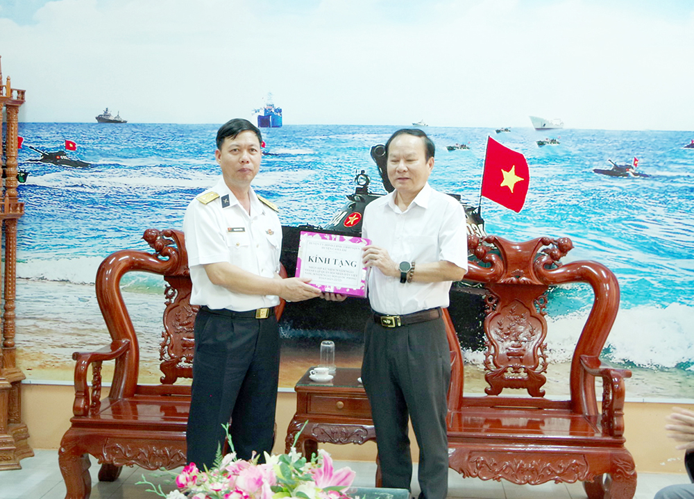 Đồng chí Ngô Văn Bảo, Phó bí thư Huyện uỷ, Chủ tịch UBND huyện Cam Lâm tặng quà cán bộ, chiến sĩ Lữ đoàn 101