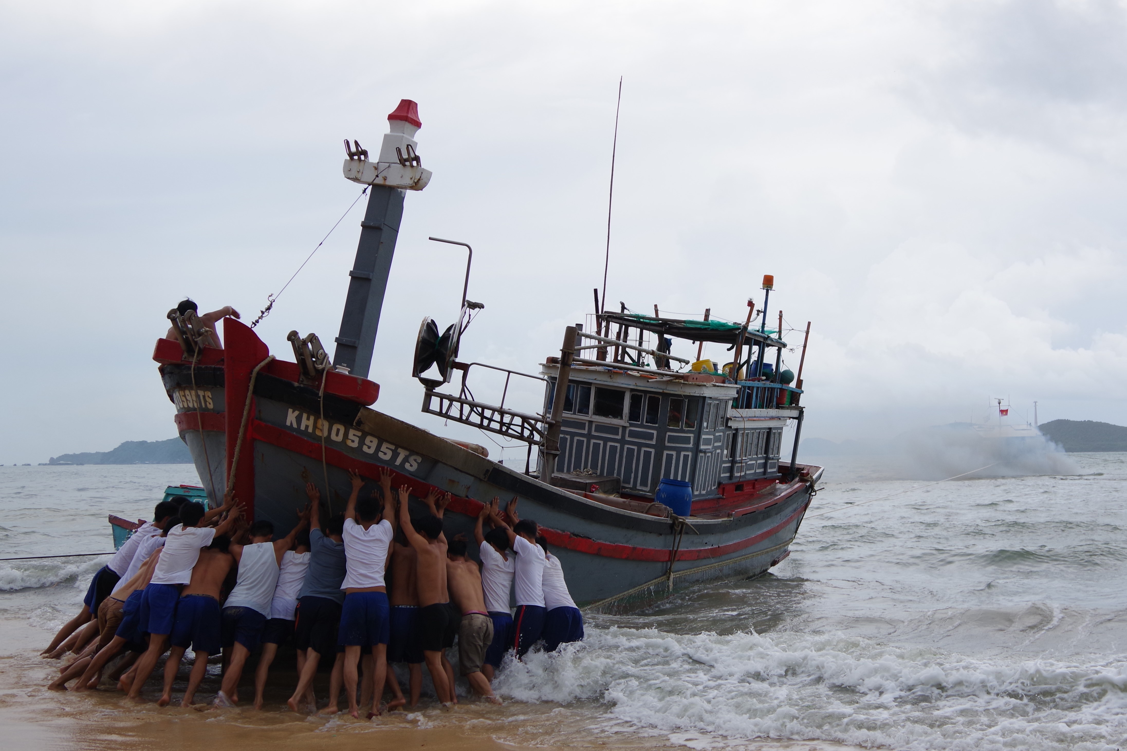 Đến 15 giờ 10, cán bộ, chiến sĩ Lữ đoàn 127 đã tổ chức đào cát phần tàu cá bị mắc cạn và làm dây cứu kéo. 2 giờ sau, tàu cá KH 90595 TS được đưa ra khỏi khu vực bị mắc cạn.